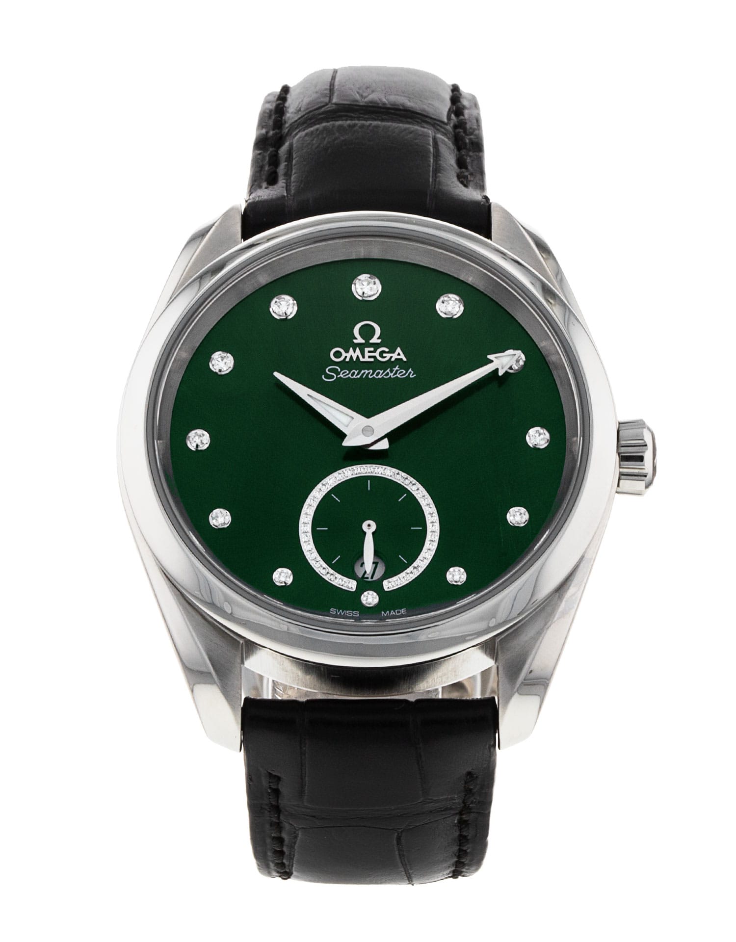 This Omega Aqua Terra 150m Gents 220.13.38.20.60.001 has a green diamond dial and a leather strap. This Omega has undergone a thorough inspection of accuracy, functionality and condition at our Omega certified service centre to determine the level of reconditioning required to meet our strict standards. It has also been checked against our records to ensure authenticity. All our watches have a 24-month warranty for your peace of mind.