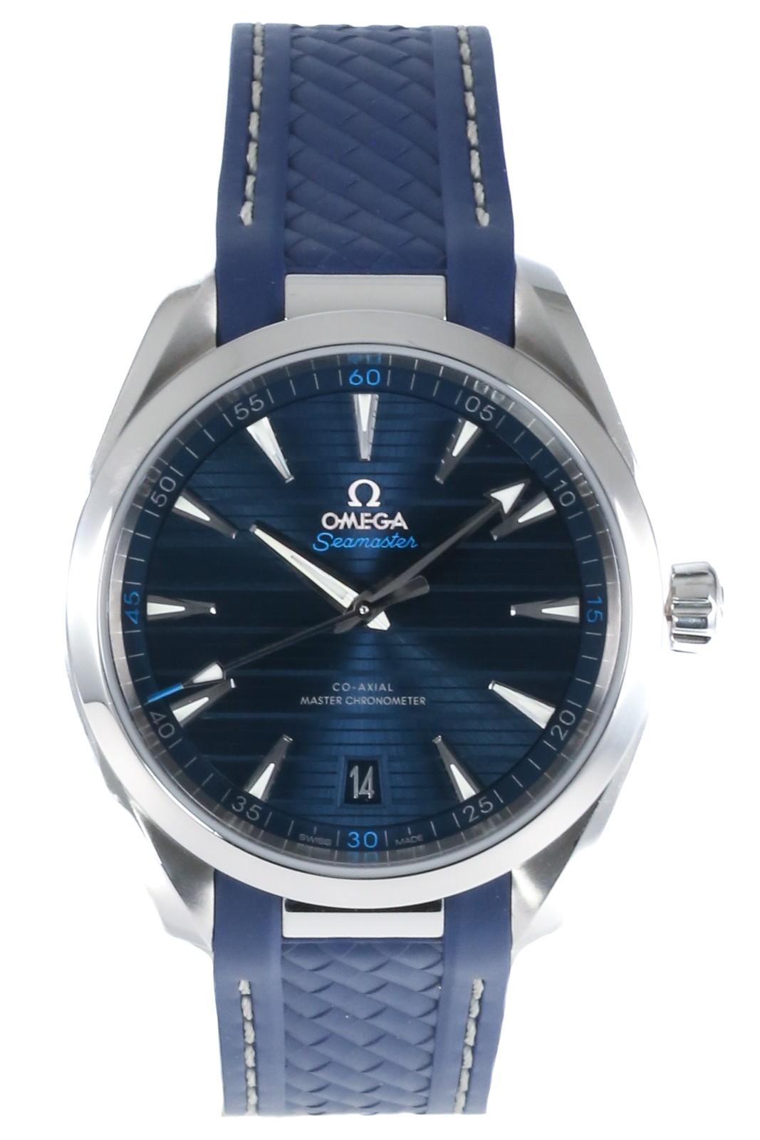 This Omega Aqua Terra 150m Gents 220.13.41.21.03.001 has a blue baton dial and a rubber strap. This Omega has undergone a thorough inspection of accuracy, functionality and condition at our Omega certified service centre to determine the level of reconditioning required to meet our strict standards. It has also been checked against our records to ensure authenticity. All our watches have a 24-month warranty for your peace of mind.