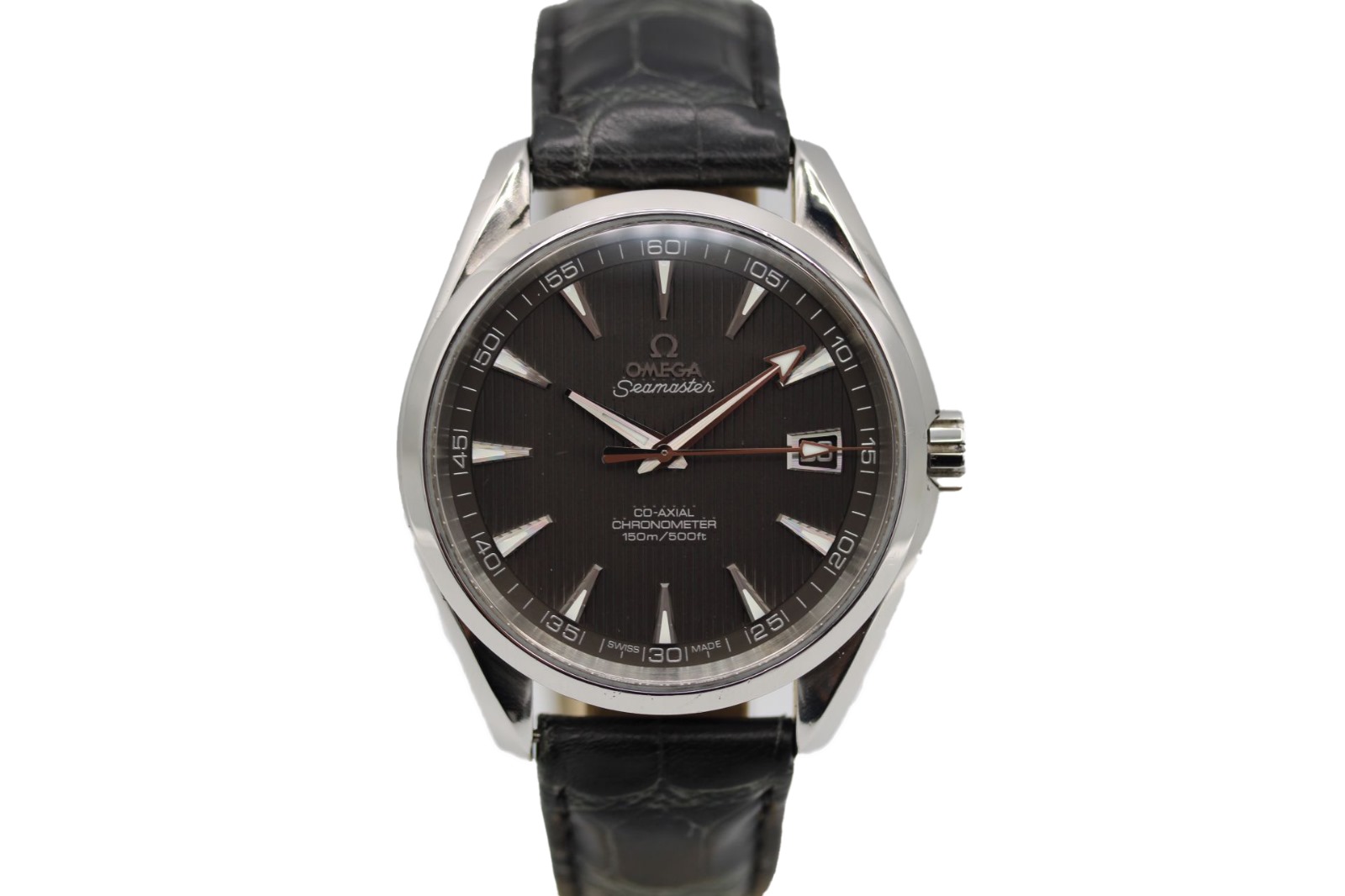 This Omega Aqua Terra 150m Gents 231.13.42.21.06.001 has a grey baton dial and a leather strap. This Omega has undergone a thorough inspection of accuracy, functionality and condition at our Omega certified service centre to determine the level of reconditioning required to meet our strict standards. It has also been checked against our records to ensure authenticity. All our watches have a 24-month warranty for your peace of mind.
