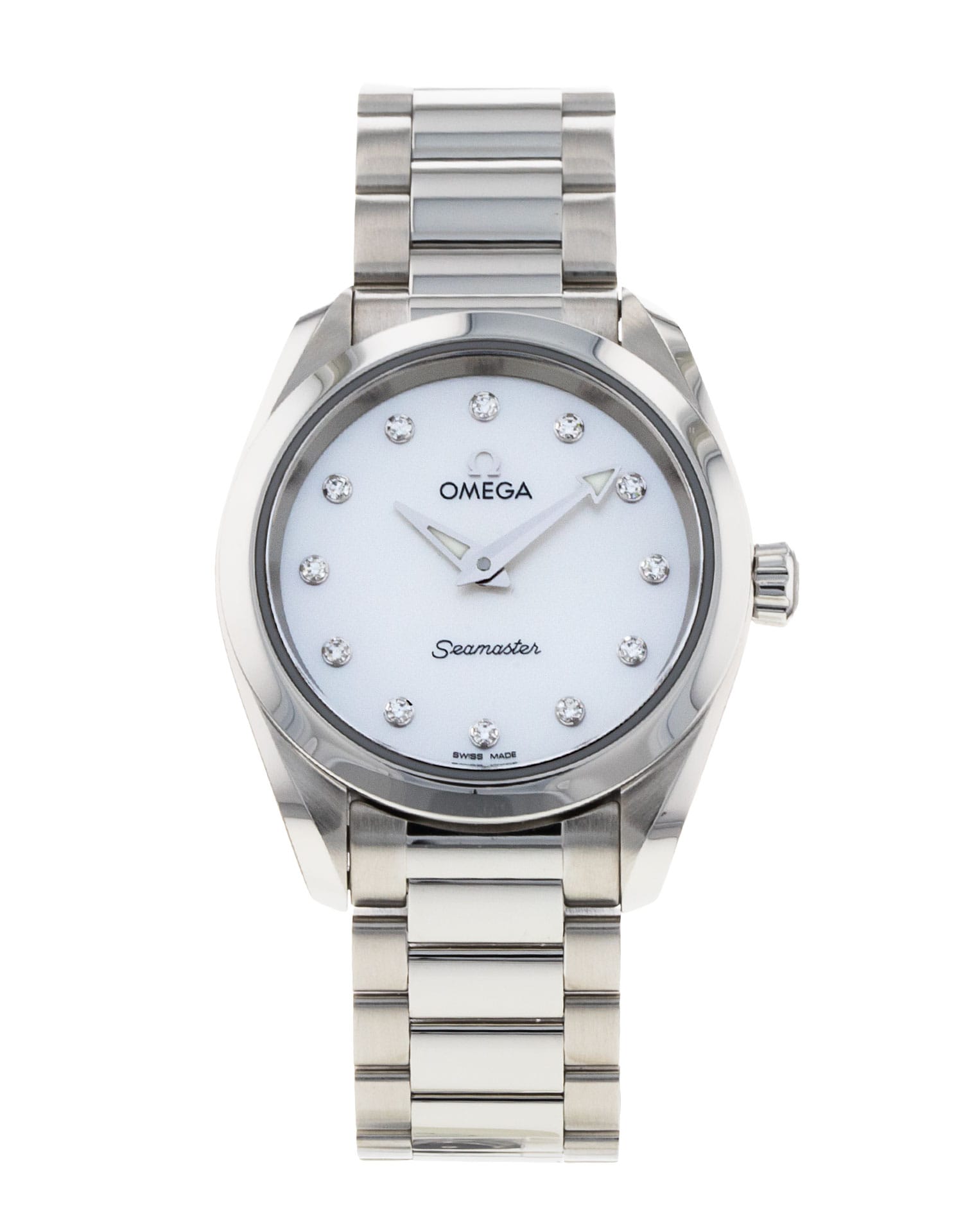 This Omega Aqua Terra 150m Ladies 220.10.28.60.55.001 has a mother of pearl white - diamond dial and a bracelet strap. This Omega has undergone a thorough inspection of accuracy, functionality and condition at our Omega certified service centre to determine the level of reconditioning required to meet our strict standards. It has also been checked against our records to ensure authenticity. Our watches have a 24-month warranty for your peace of mind, in conjunction with any remaining manufacturer’s warranty from new or from service.