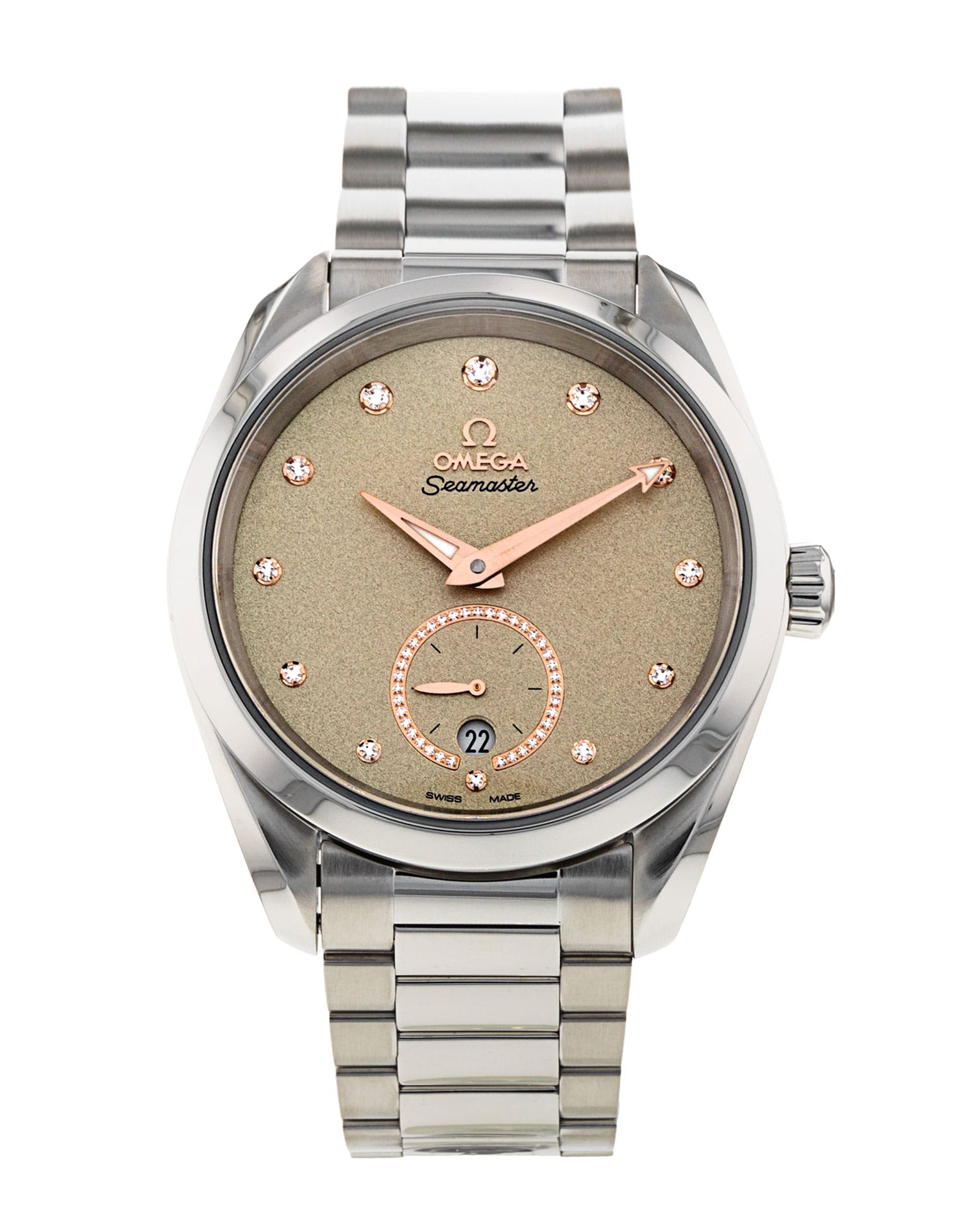 This Omega Aqua Terra 150m Ladies 220.10.38.20.59.001 has a cream diamond dial and a bracelet strap. This Omega has undergone a thorough inspection of accuracy, functionality and condition at our Omega certified service centre to determine the level of reconditioning required to meet our strict standards. It has also been checked against our records to ensure authenticity. Our watches have a 24-month warranty for your peace of mind, in conjunction with any remaining manufacturer’s warranty from new or from service.