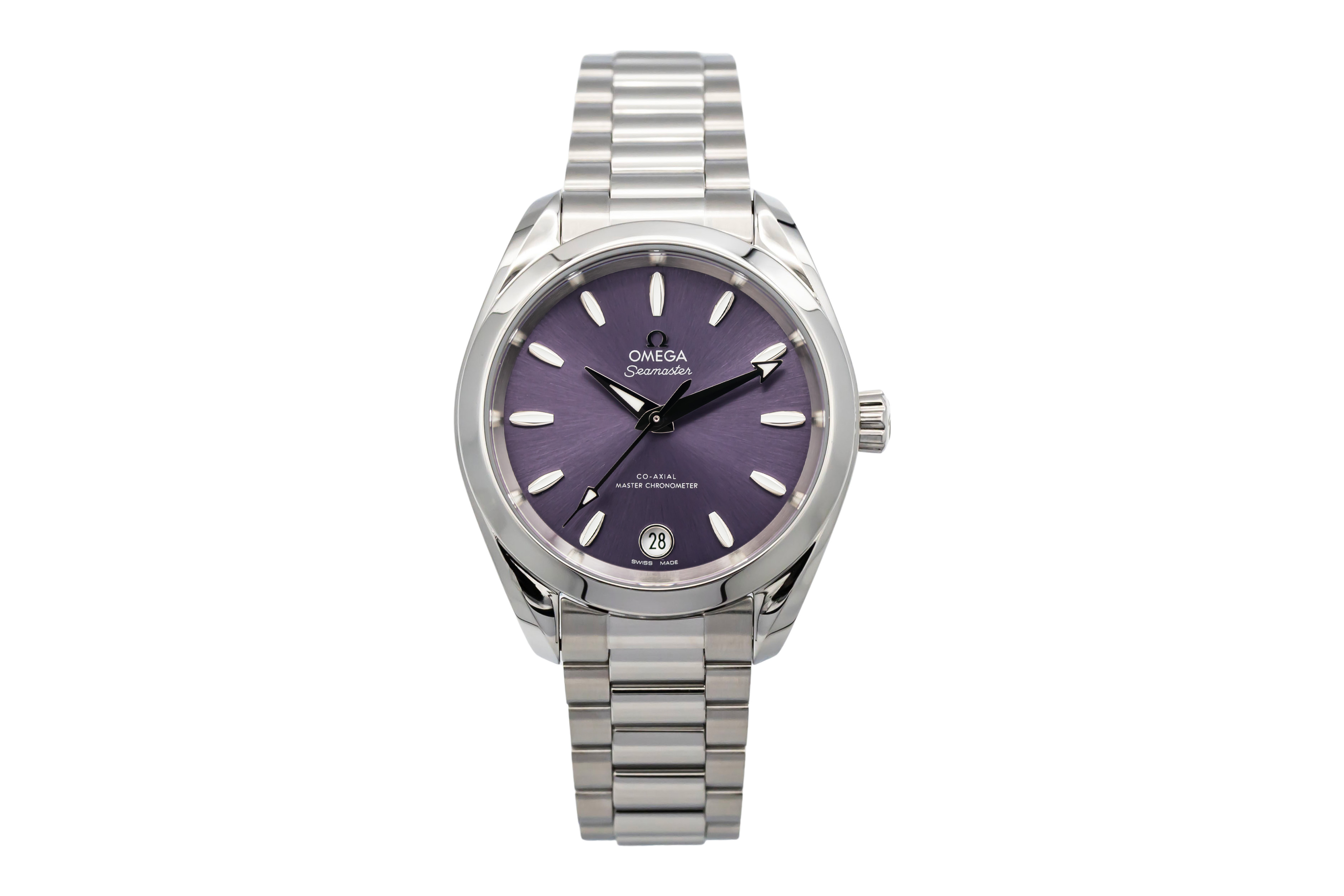 This Omega Aqua Terra Shades 220.10.34.20.10.002 has a lavender dial and a bracelet strap. This Omega has undergone a thorough inspection of accuracy, functionality and condition at our Omega certified service centre to determine the level of reconditioning required to meet our strict standards. It has also been checked against our records to ensure authenticity. All our watches have a 24-month warranty for your peace of mind.