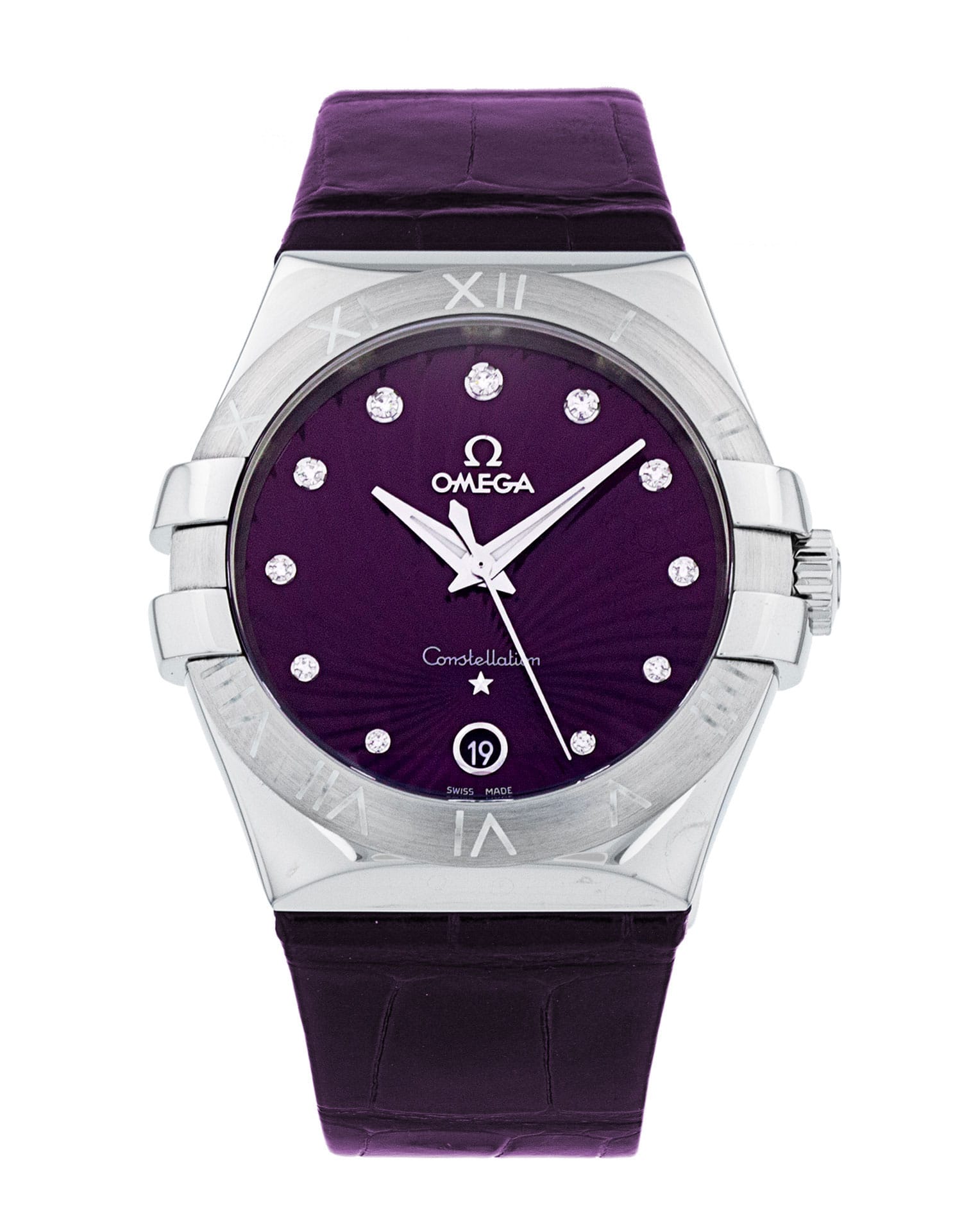This Omega Constellation Ladies 123.13.35.60.60.001 has a purple diamond dial and a leather strap. This Omega has undergone a thorough inspection of accuracy, functionality and condition at our Omega certified service centre to determine the level of reconditioning required to meet our strict standards. It has also been checked against our records to ensure authenticity. All our watches have a 24-month warranty for your peace of mind.