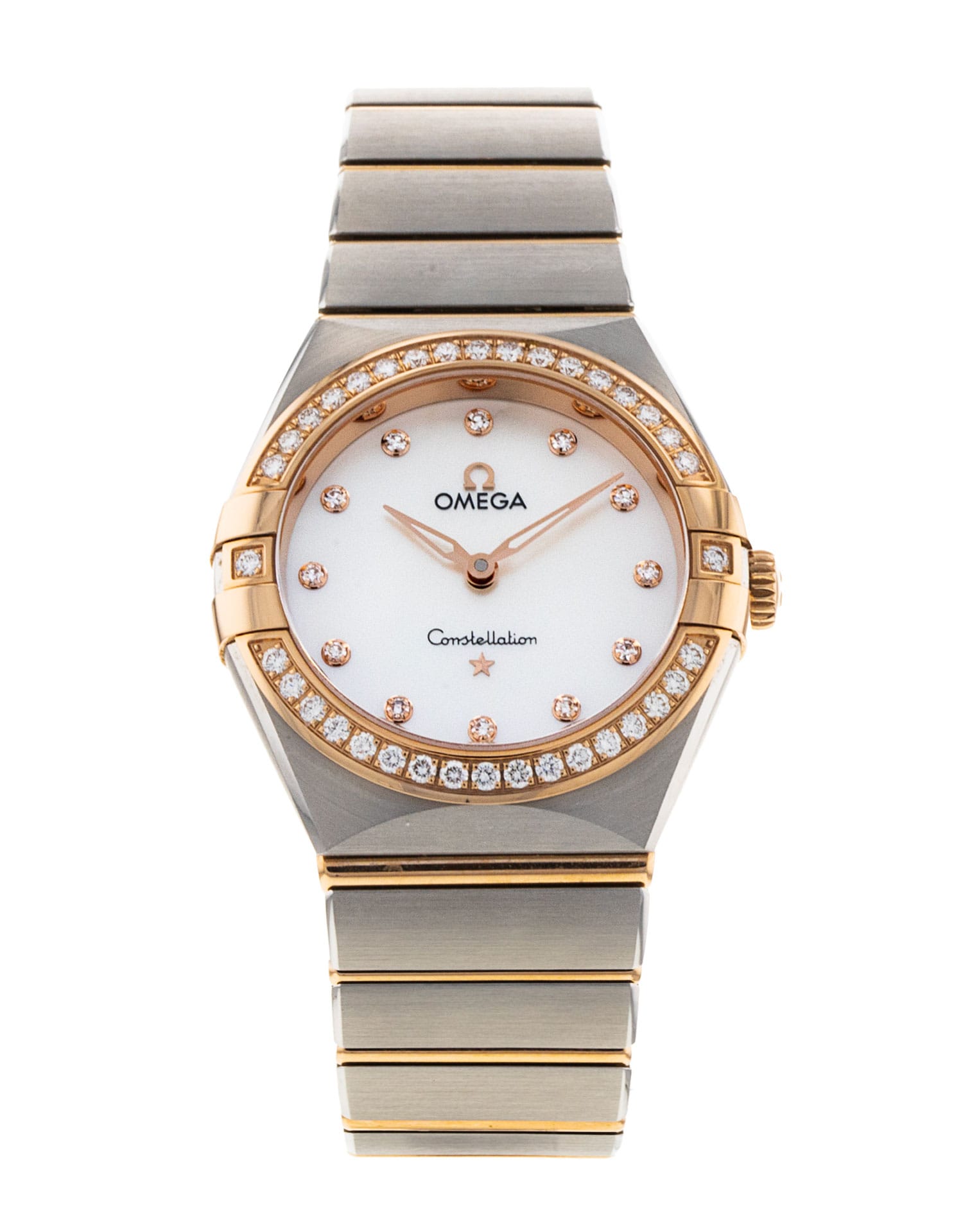 This Omega Constellation Ladies 131.25.28.60.55.001 has a mother of pearl white - diamond dial and a bracelet strap. This Omega has undergone a thorough inspection of accuracy, functionality and condition at our Omega certified service centre to determine the level of reconditioning required to meet our strict standards. It has also been checked against our records to ensure authenticity. All our watches have a 24-month warranty for your peace of mind.
