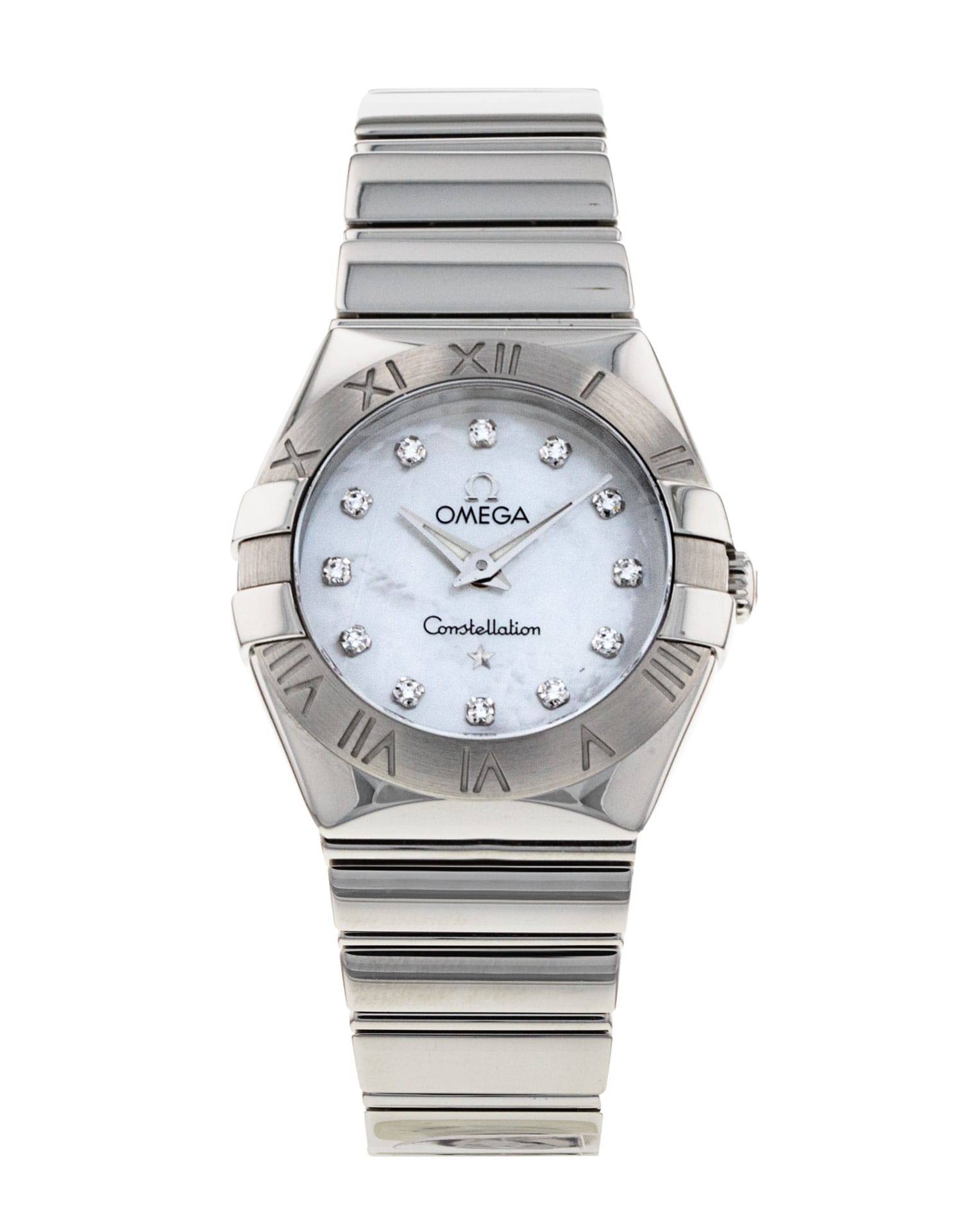 This Omega Constellation Mini 123.10.24.60.55.002 has a mother of pearl white - diamond dial and a bracelet strap. This Omega has undergone a thorough inspection of accuracy, functionality and condition at our Omega certified service centre to determine the level of reconditioning required to meet our strict standards. It has also been checked against our records to ensure authenticity. All our watches have a 24-month warranty for your peace of mind.