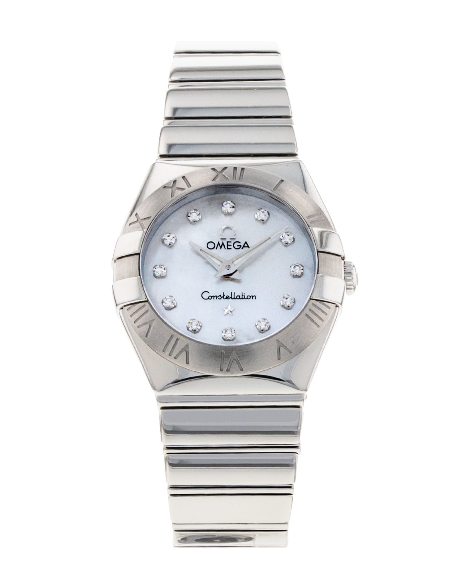 This Omega Constellation Mini 123.10.24.60.55.002 has a mother of pearl white - diamond dial and a bracelet strap. This Omega has undergone a thorough inspection of accuracy, functionality and condition at our Omega certified service centre to determine the level of reconditioning required to meet our strict standards. It has also been checked against our records to ensure authenticity. All our watches have a 24-month warranty for your peace of mind.