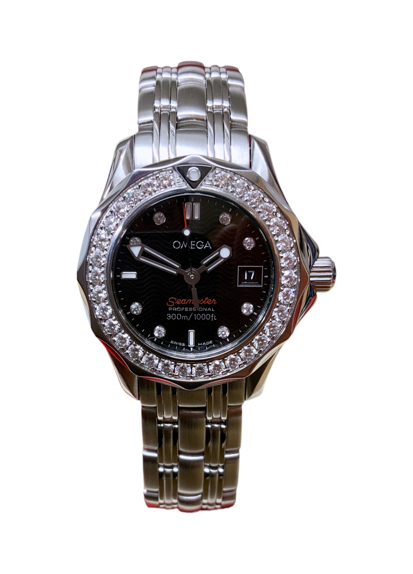 This Omega Seamaster 300m Ladies 212.15.28.61.51.001 has a black diamond dial and a bracelet strap. This Omega has undergone a thorough inspection of accuracy, functionality and condition at our Omega certified service centre to determine the level of reconditioning required to meet our strict standards. It has also been checked against our records to ensure authenticity. Our watches have a 24-month warranty for your peace of mind, in conjunction with any remaining manufacturer’s warranty from new or from service.