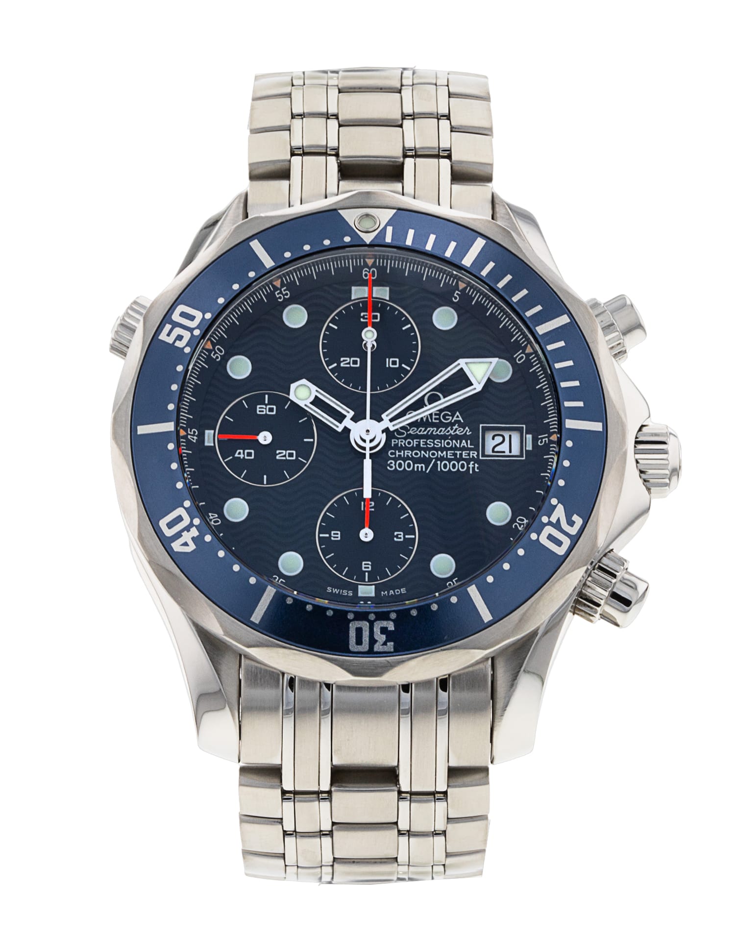 This Omega Seamaster Chrono Diver 2599.80.00 has a blue dial and a bracelet strap. This Omega has undergone a thorough inspection of accuracy, functionality and condition at our Omega certified service centre to determine the level of reconditioning required to meet our strict standards. It has also been checked against our records to ensure authenticity. All our watches have a 24-month warranty for your peace of mind.