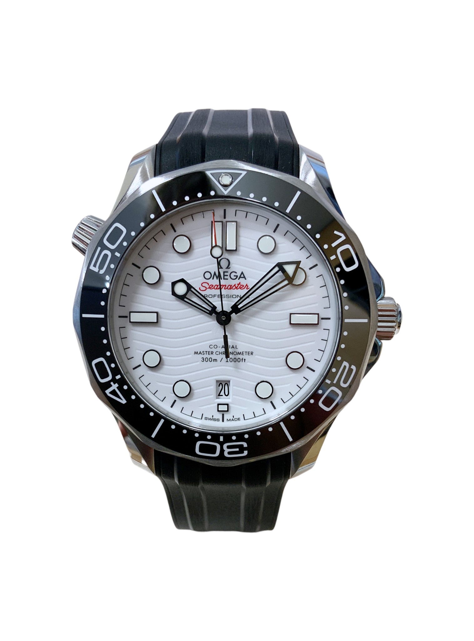 This Omega Seamaster Diver 300m 210.32.42.20.04.001 has a white dial and a rubber strap. This Omega has undergone a thorough inspection of accuracy, functionality and condition at our Omega certified service centre to determine the level of reconditioning required to meet our strict standards. It has also been checked against our records to ensure authenticity. Our watches have a 24-month warranty for your peace of mind, in conjunction with any remaining manufacturer’s warranty from new or from service.