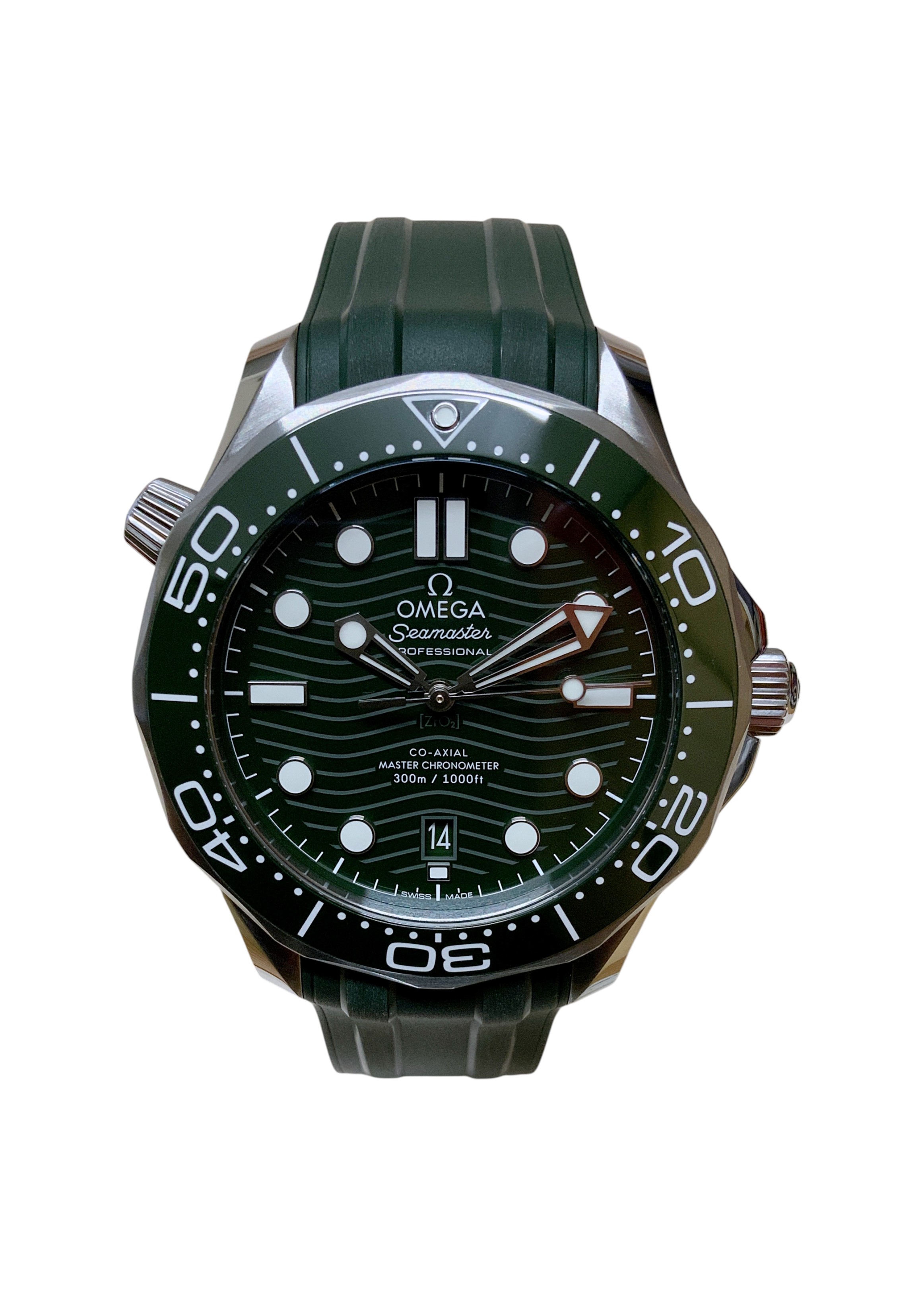 This Omega Seamaster Diver 300m 210.32.42.20.10.001 has a green dial and a rubber strap. This Omega has undergone a thorough inspection of accuracy, functionality and condition at our Omega certified service centre to determine the level of reconditioning required to meet our strict standards. It has also been checked against our records to ensure authenticity. Our watches have a 24-month warranty for your peace of mind, in conjunction with any remaining manufacturer’s warranty from new or from service.