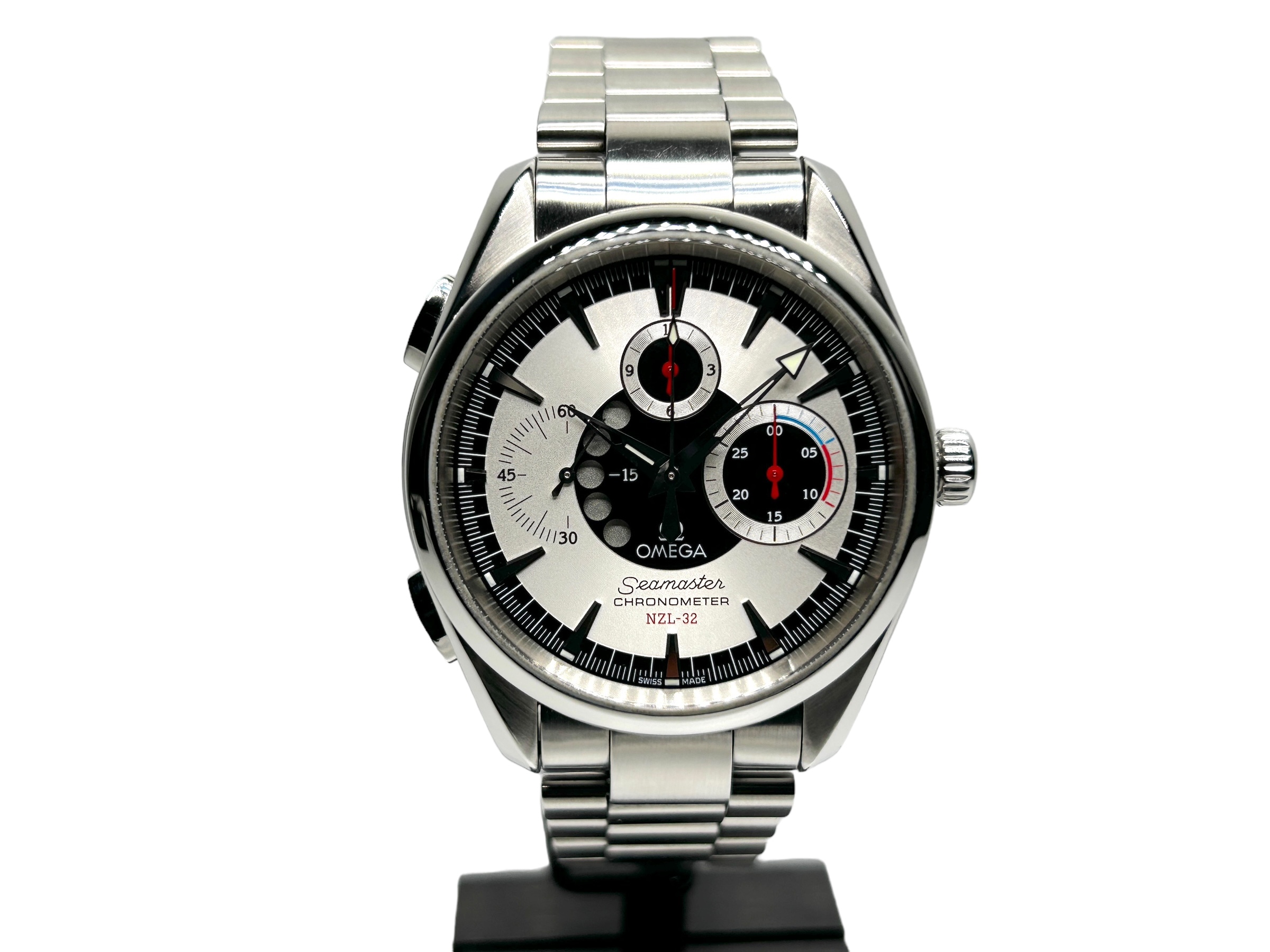 Omega was the official timekeeping partner of Team New Zealand at the 2003 America's Cup, and released this special edition watch in its honour. The name NZL-32 is taken from the team's winning boat in 1995. This is a high precision instrument that can measure to an eighth of a second and has been built especially for use in regattas, but it's also a very beautiful timepiece aesthetically, with a gorgeous, clean design that looks suited to the yachting lifestyle. The special regatta function can be found in the five circles just to the left of centre, which turn from red to blue over ten minutes (the time between initial and starting signals at the America's Cup).