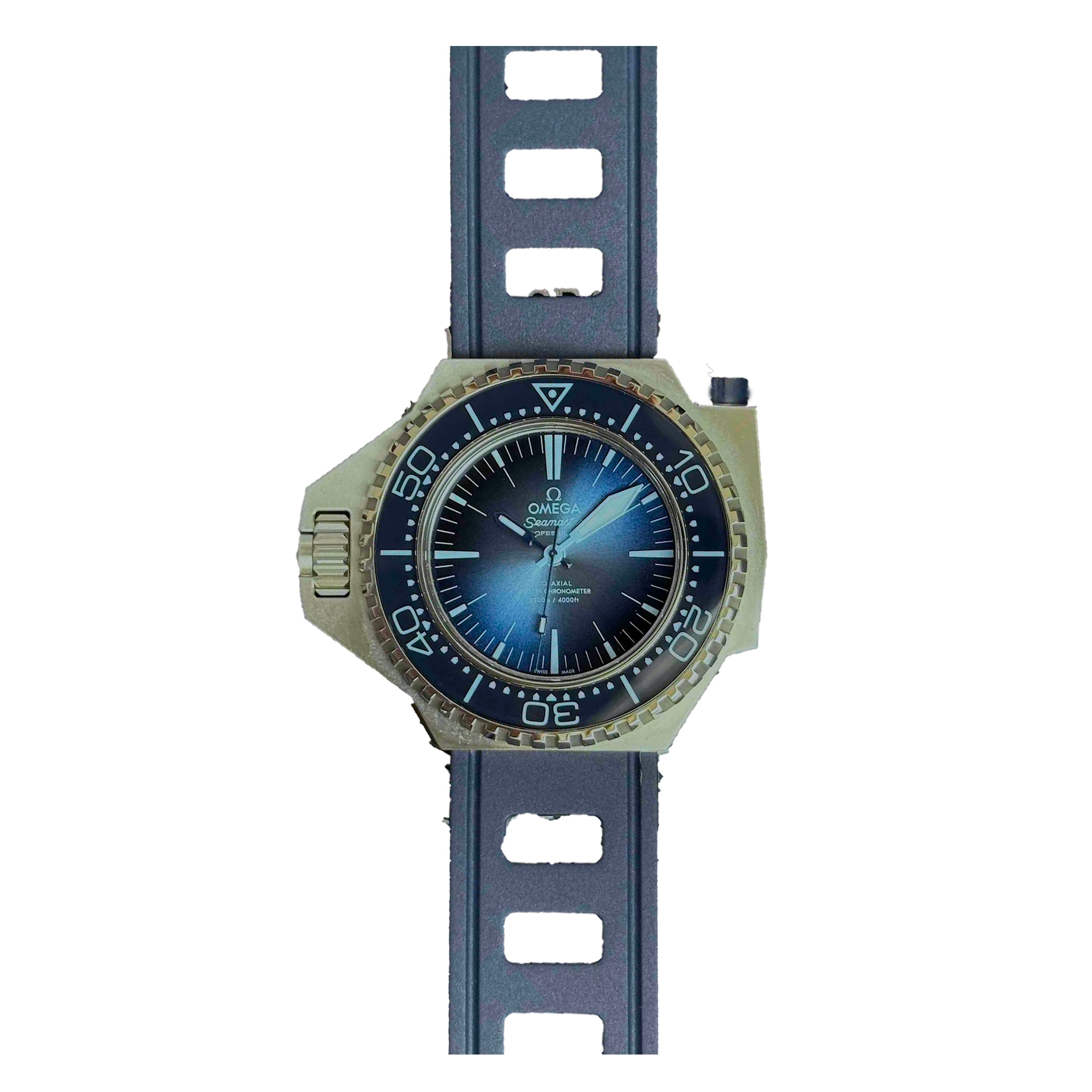 This Omega Seamaster Ploprof 1200m 227.32.55.21.03.001 has a blue dial and a rubber strap. This Omega has undergone a thorough inspection of accuracy, functionality and condition at our Omega certified service centre to determine the level of reconditioning required to meet our strict standards. It has also been checked against our records to ensure authenticity. Our watches have a 24-month warranty for your peace of mind, in conjunction with any remaining manufacturer’s warranty from new or from service.