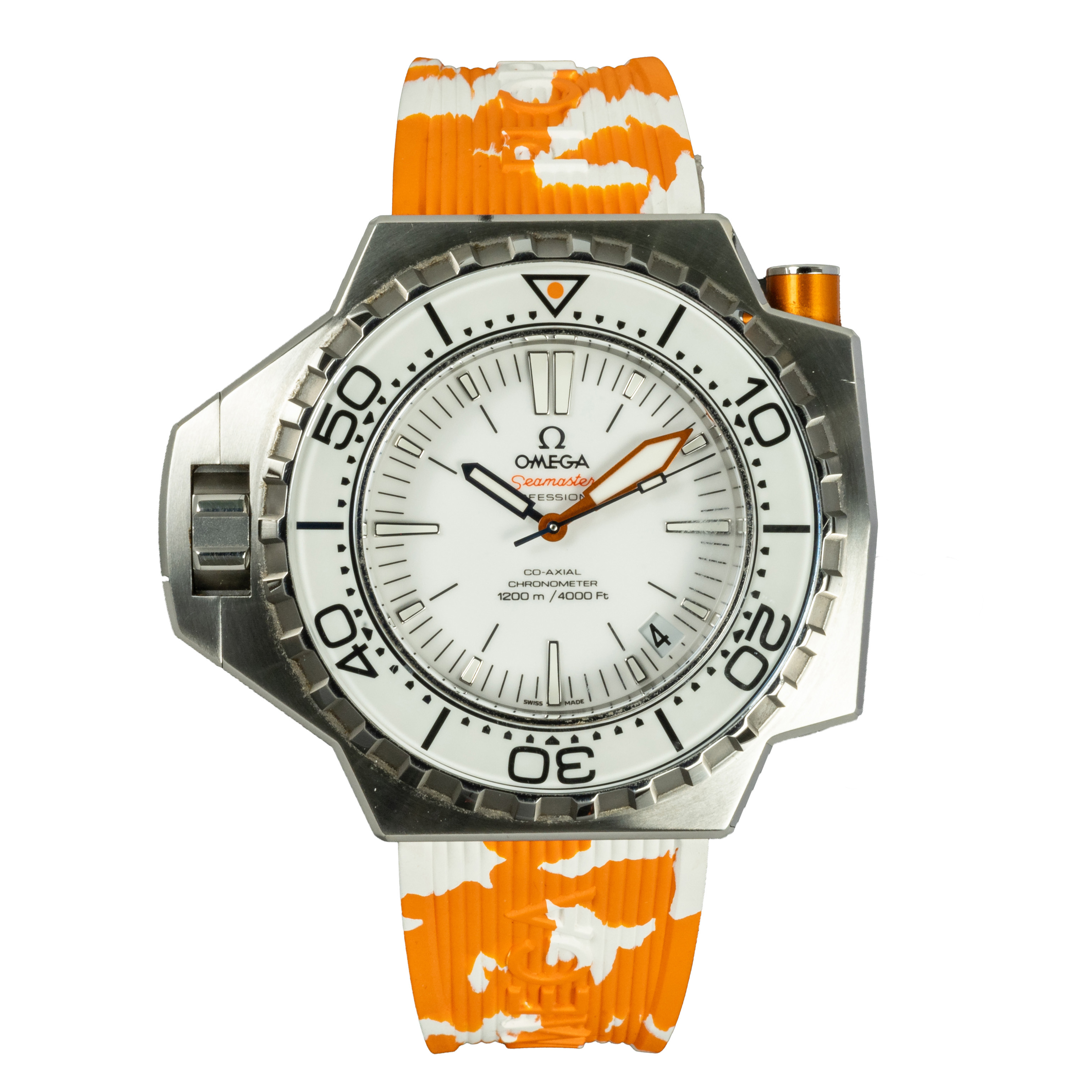 This Omega Seamaster Ploprof 224.30.55.21.04.001 has a white baton dial and a rubber strap. This Omega has undergone a thorough inspection of accuracy, functionality and condition at our Omega certified service centre to determine the level of reconditioning required to meet our strict standards. It has also been checked against our records to ensure authenticity. All our watches have a 24-month warranty for your peace of mind.