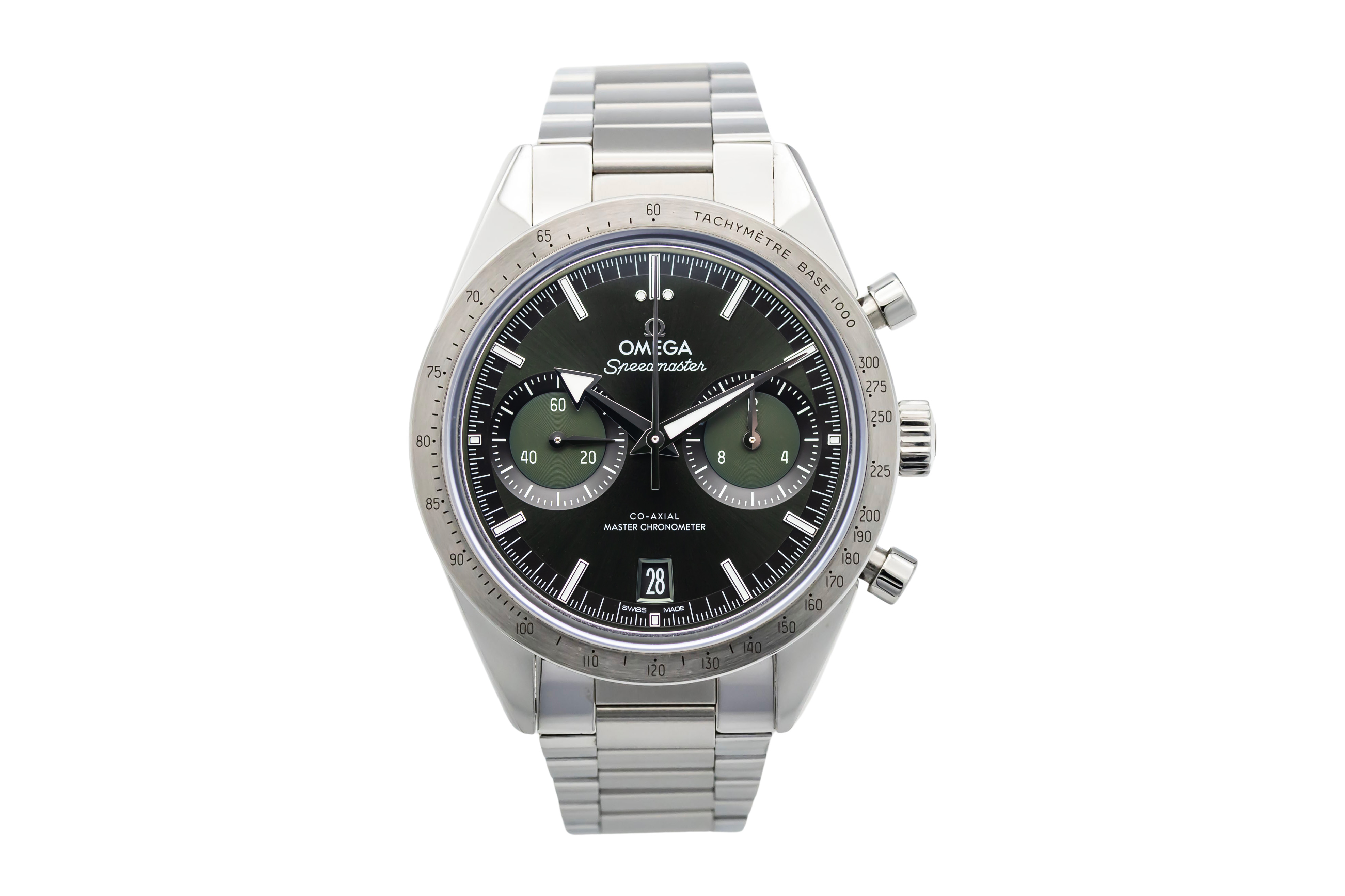 This Omega Speedmaster 57 332.10.41.51.10.001 has a green baton dial and a bracelet strap. This Omega has undergone a thorough inspection of accuracy, functionality and condition at our Omega certified service centre to determine the level of reconditioning required to meet our strict standards. It has also been checked against our records to ensure authenticity. All our watches have a 24-month warranty for your peace of mind.