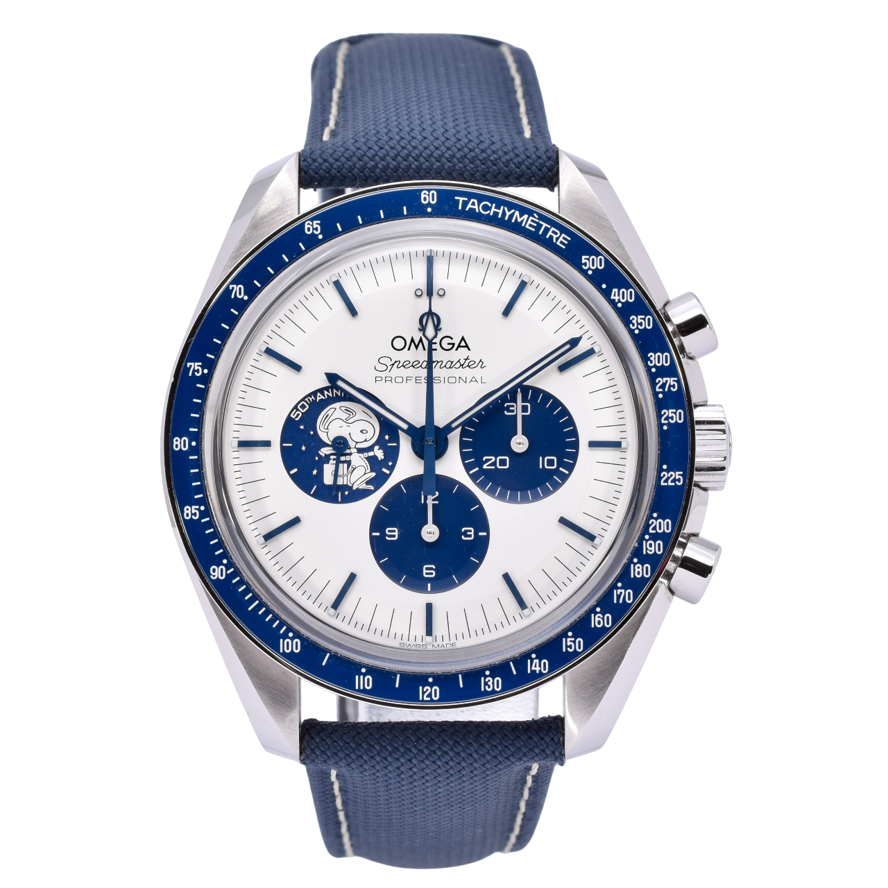 This Omega Speedmaster Anniversary Series 310.32.42.50.02.001 has a silver baton dial and a fabric strap. This Omega has undergone a thorough inspection of accuracy, functionality and condition at our Omega certified service centre to determine the level of reconditioning required to meet our strict standards. It has also been checked against our records to ensure authenticity. Our watches have a 24-month warranty for your peace of mind, in conjunction with any remaining manufacturer’s warranty from new or from service.