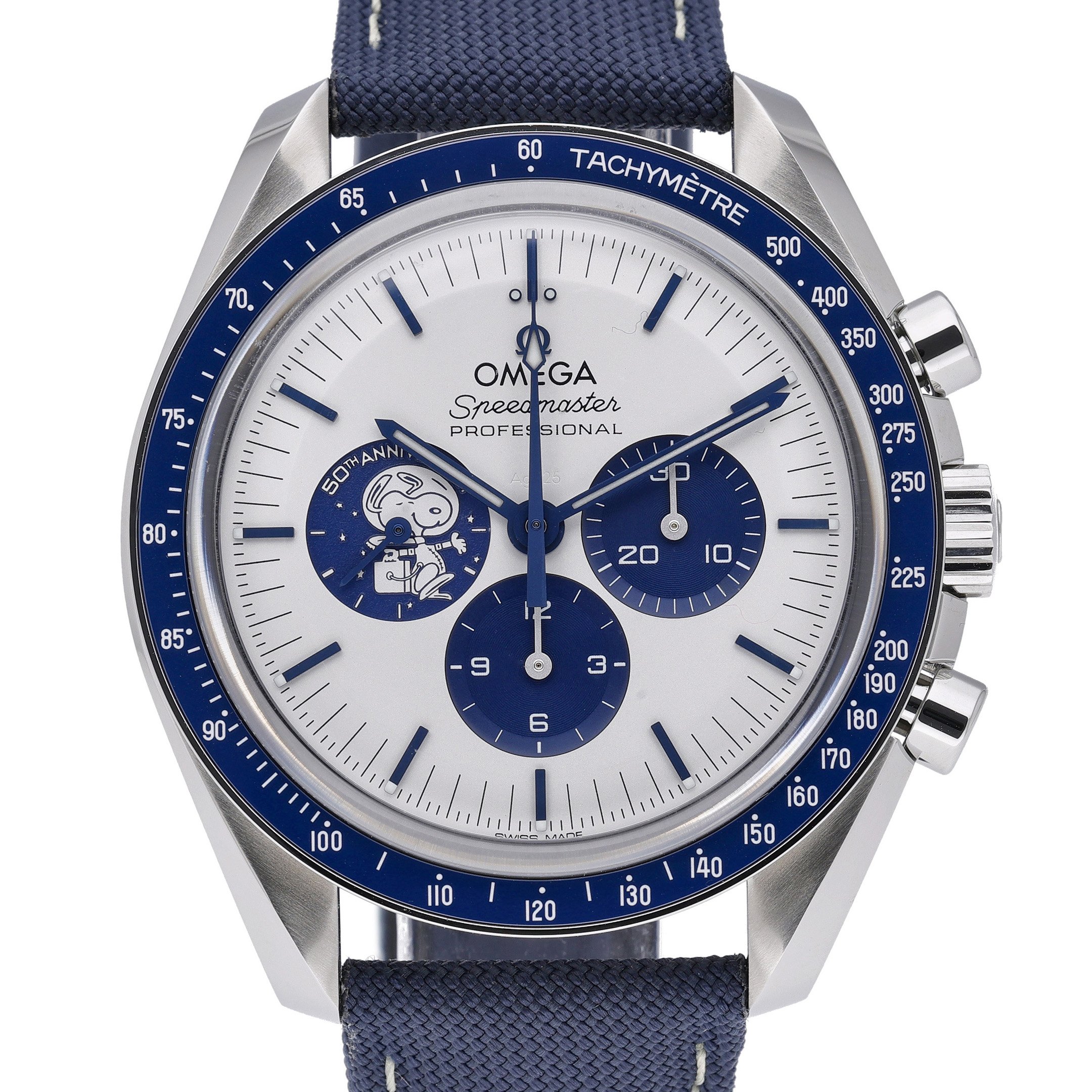 This Omega Speedmaster Anniversary Series 310.32.42.50.02.001 has a silver baton dial and a fabric strap. This Omega has undergone a thorough inspection of accuracy, functionality and condition at our Omega certified service centre to determine the level of reconditioning required to meet our strict standards. It has also been checked against our records to ensure authenticity. Our watches have a 24-month warranty for your peace of mind, in conjunction with any remaining manufacturer’s warranty from new or from service.