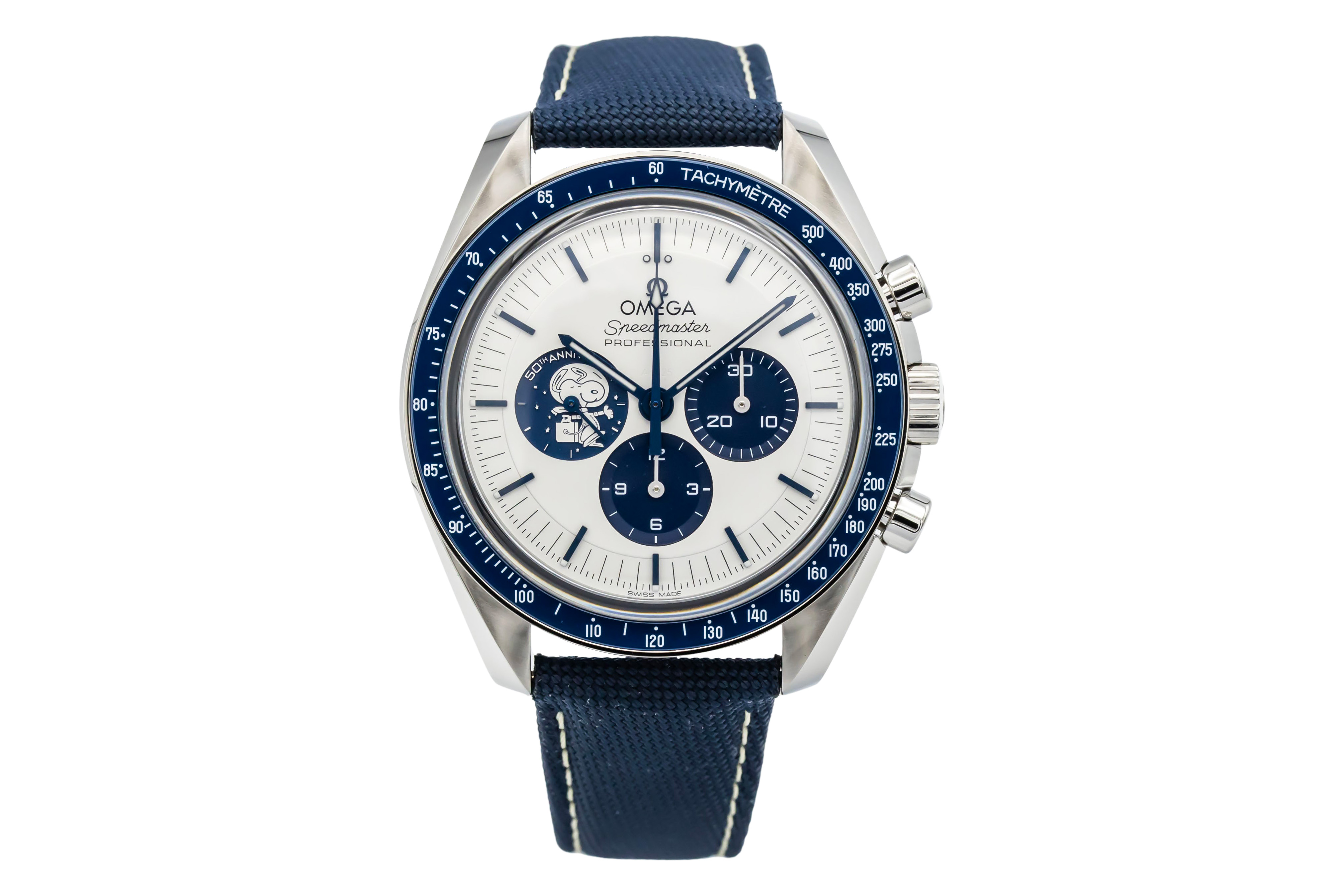 This Omega Speedmaster Anniversary Series 310.32.42.50.02.001 has a silver baton dial and a fabric strap. This Omega has undergone a thorough inspection of accuracy, functionality and condition at our Omega certified service centre to determine the level of reconditioning required to meet our strict standards. It has also been checked against our records to ensure authenticity. Our watches have a 24-month warranty for your peace of mind, in conjunction with any remaining manufacturer’s warranty from new or from service.