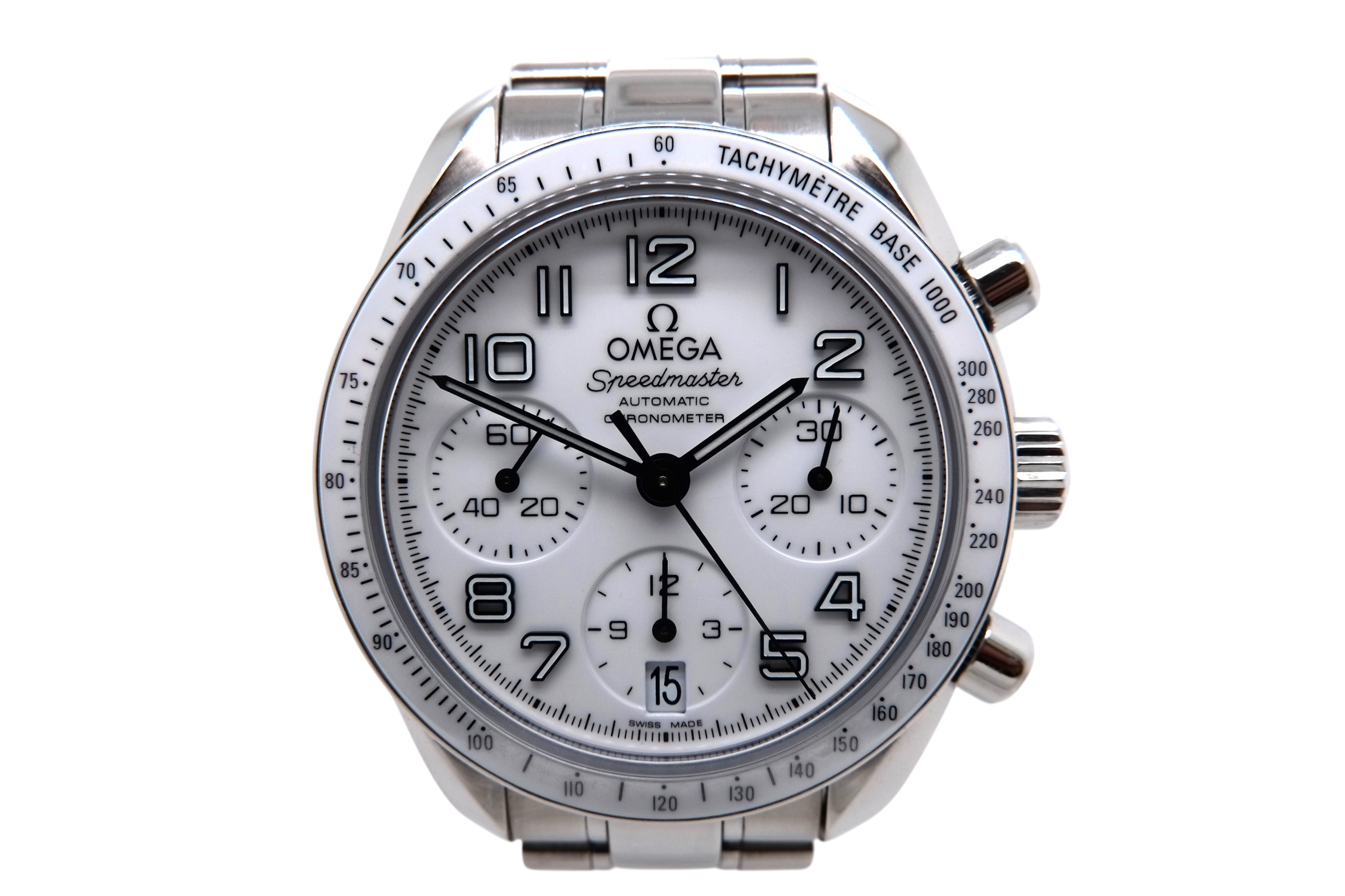 This Omega Speedmaster Automatic Chronometer 324.33.38.40.04.001 has a white arabic dial and a leather strap. This Omega has undergone a thorough inspection of accuracy, functionality and condition at our Omega certified service centre to determine the level of reconditioning required to meet our strict standards. It has also been checked against our records to ensure authenticity. All our watches have a 24-month warranty for your peace of mind.