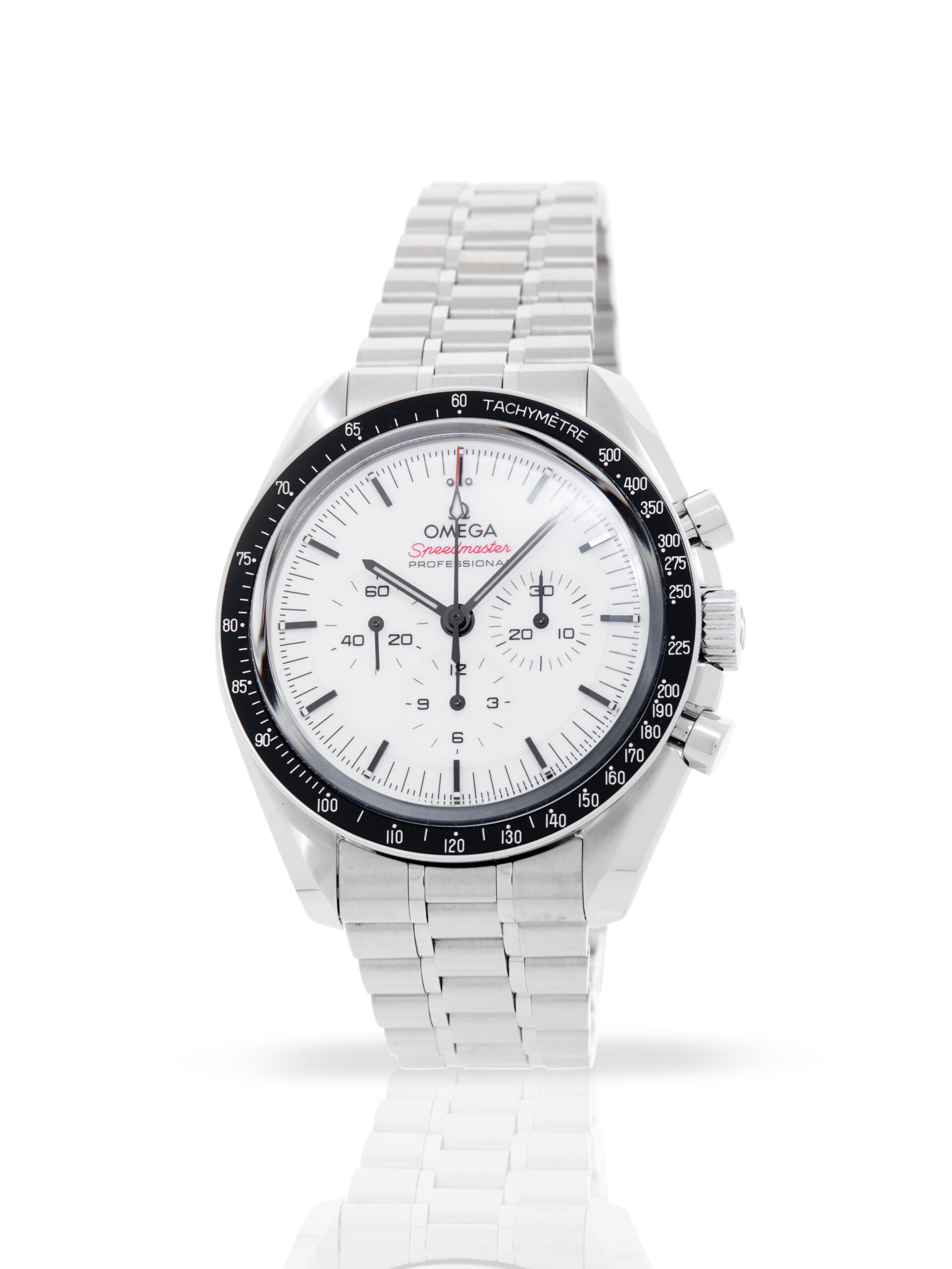 This Omega Speedmaster Moonwatch Professional 310.30.42.50.04.001 has a white baton dial and a bracelet strap. This Omega has undergone a thorough inspection of accuracy, functionality and condition at our Omega certified service centre to determine the level of reconditioning required to meet our strict standards. It has also been checked against our records to ensure authenticity. Our watches have a 24-month warranty for your peace of mind, in conjunction with any remaining manufacturer’s warranty from new or from service.