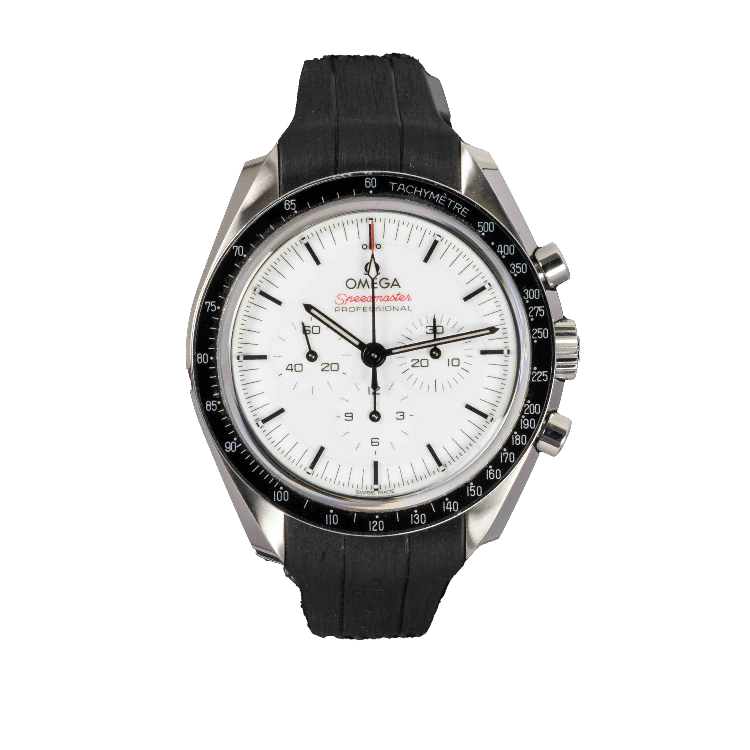 This Omega Speedmaster Moonwatch Professional 310.32.42.50.04.001 has a white dial and a rubber strap. This Omega has undergone a thorough inspection of accuracy, functionality and condition at our Omega certified service centre to determine the level of reconditioning required to meet our strict standards. It has also been checked against our records to ensure authenticity. Our watches have a 24-month warranty for your peace of mind, in conjunction with any remaining manufacturer’s warranty from new or from service.
