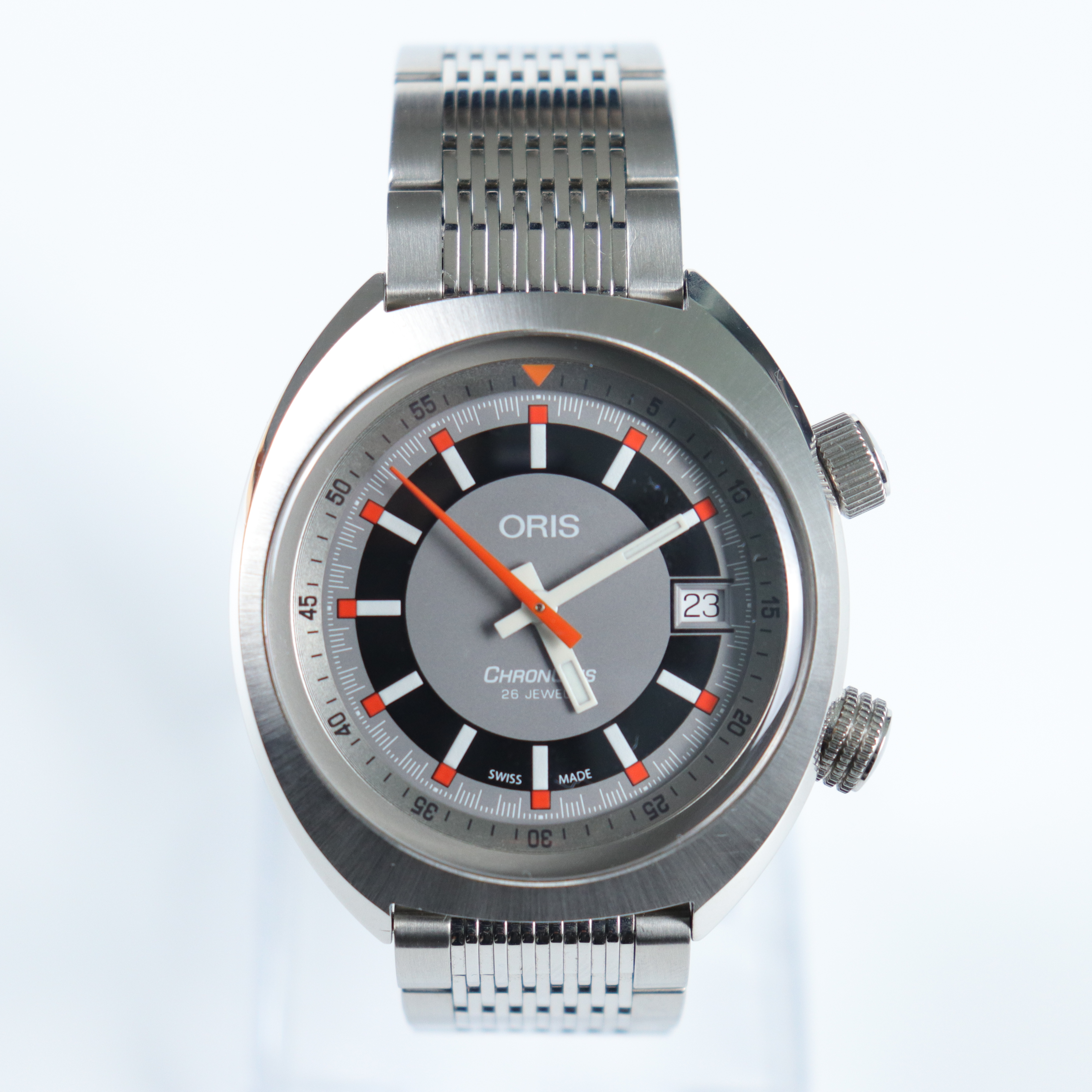 This Oris Chronoris 733 7737 40 53 RS has a grey dial and a rubber strap. This Oris has undergone a thorough inspection of water resistance, accuracy, functionality and condition to determine the level of reconditioning required to meet our strict standards. It has also been referenced against technical documents and manufacturer records where available to ensure authenticity and a clean history. All our watches have a 24-month warranty for your peace of mind.
