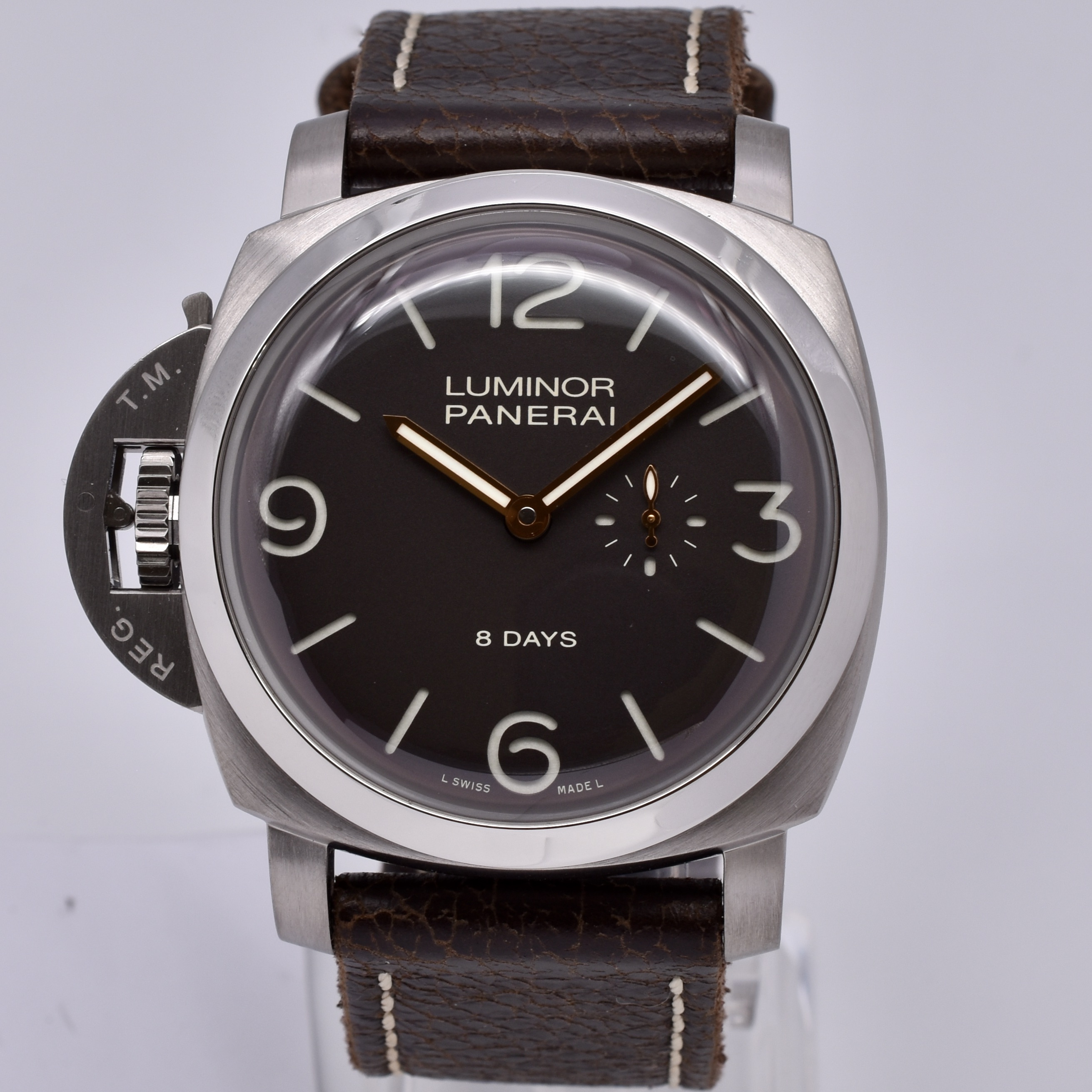 This Panerai Luminor 1950 PAM00368 has a brown quarter arabic dial and a leather strap. This Panerai has undergone a thorough inspection of accuracy, functionality and condition at our Panerai certified service centre to determine the level of reconditioning required to meet our strict standards. It has also been checked against our records to ensure authenticity. All our watches have a 24-month warranty for your peace of mind.