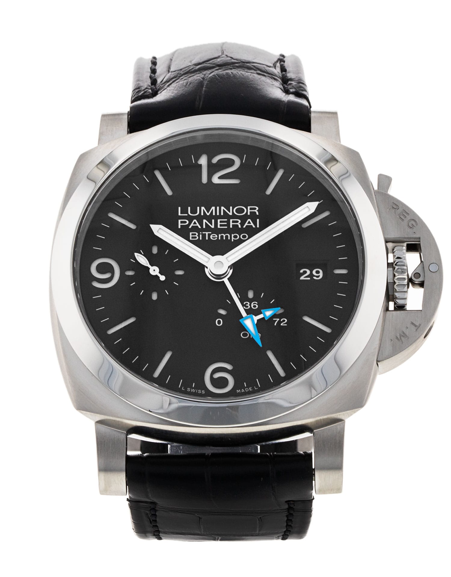 This Panerai Luminor BiTempo PAM01360 has a black quarter arabic dial and a leather strap. This Panerai has undergone a thorough inspection of accuracy, functionality and condition at our Panerai certified service centre to determine the level of reconditioning required to meet our strict standards. It has also been checked against our records to ensure authenticity. Our watches have a 24-month warranty for your peace of mind, in conjunction with any remaining manufacturer’s warranty from new or from service.