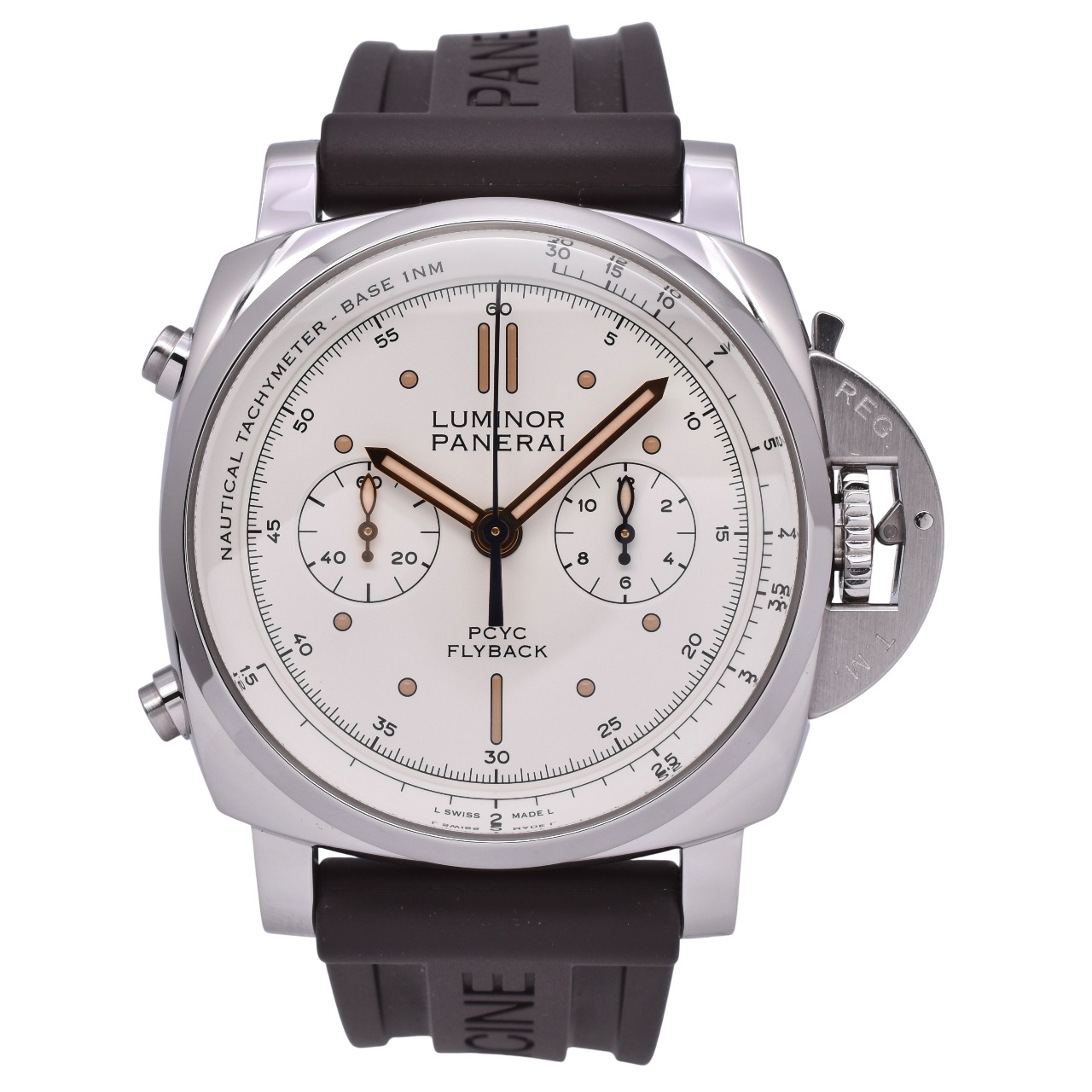 This Panerai Luminor Chrono PAM00654 has a ivory dial and a leather strap. This Panerai has undergone a thorough inspection of accuracy, functionality and condition at our Panerai certified service centre to determine the level of reconditioning required to meet our strict standards. It has also been checked against our records to ensure authenticity. Our watches have a 24-month warranty for your peace of mind, in conjunction with any remaining manufacturer’s warranty from new or from service.