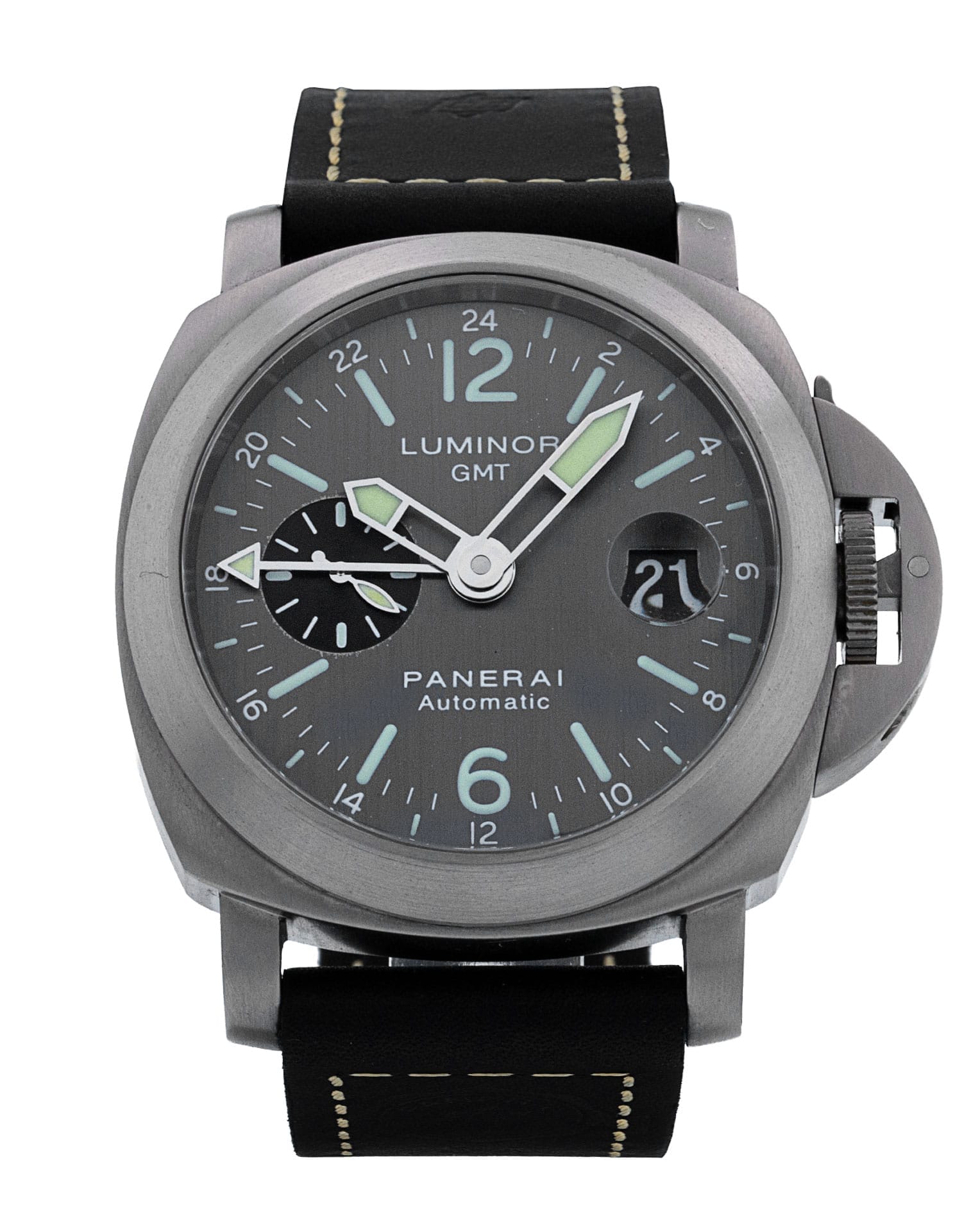 This Panerai Luminor GMT PAM00089 has a anthracite dial and a leather strap. This Panerai has undergone a thorough inspection of accuracy, functionality and condition at our Panerai certified service centre to determine the level of reconditioning required to meet our strict standards. It has also been checked against our records to ensure authenticity. All our watches have a 24-month warranty for your peace of mind.