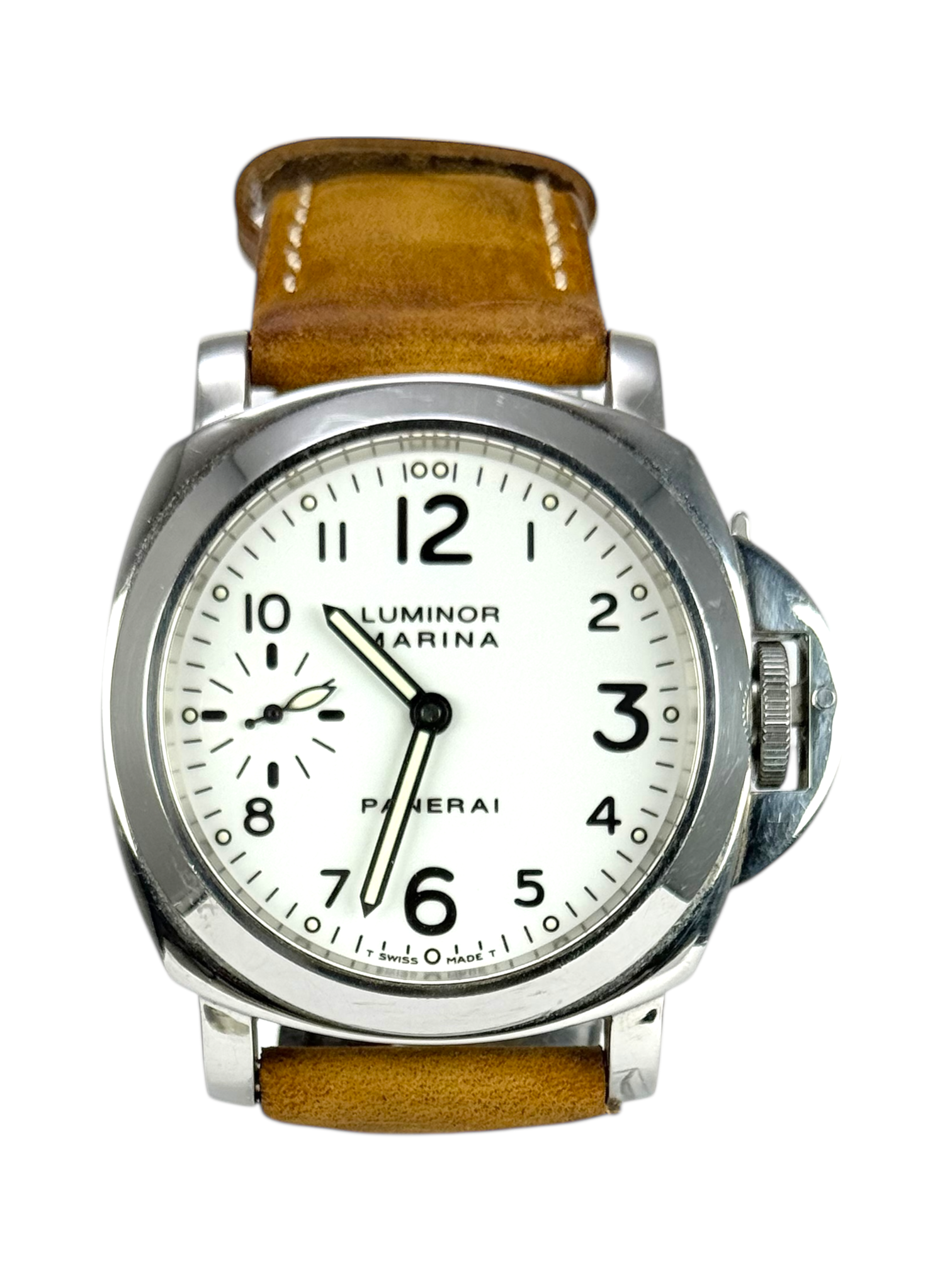 This Panerai Luminor Marina PAM00003 has a white arabic dial and a leather strap. This Panerai has undergone a thorough inspection of accuracy, functionality and condition at our Panerai certified service centre to determine the level of reconditioning required to meet our strict standards. It has also been checked against our records to ensure authenticity. All our watches have a 24-month warranty for your peace of mind.