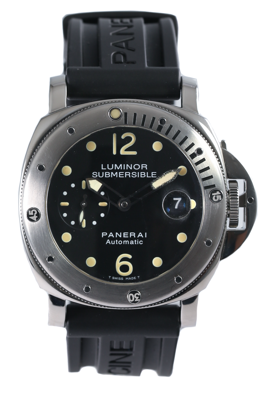 This Panerai Luminor Submersible PAM00024 has a black dial and a rubber strap. This Panerai has undergone a thorough inspection of accuracy, functionality and condition at our Panerai certified service centre to determine the level of reconditioning required to meet our strict standards. It has also been checked against our records to ensure authenticity. All our watches have a 24-month warranty for your peace of mind.