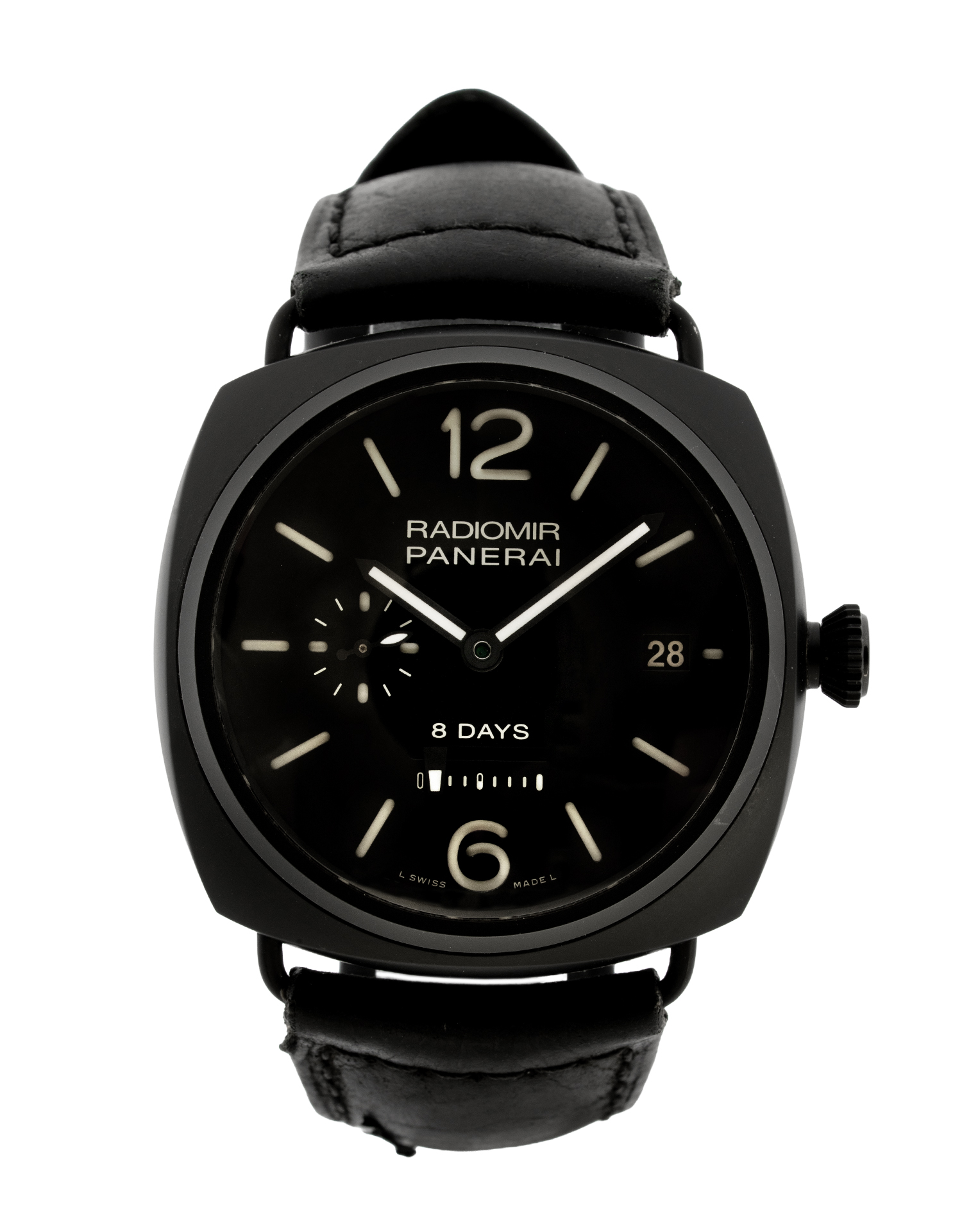 Panerai has several watches with amazingly long power reserves, yet even by its standards, this 8-day Radiomir is pretty darn cool. The watch harnesses three large mainspring barrels to generate this much power, and the superb mechanical specs of the in-house P.2002 movement ensure that this energy is distributed cleanly and evenly without any compromise of timekeeping precision. In addition to the power reserve, which has a 'linear' display at 6 o'clock, the watch also boasts a stunning black aesthetic made possible by the extraordinary ceramic case material, formed from the isostatic pressing of zirconium oxide.