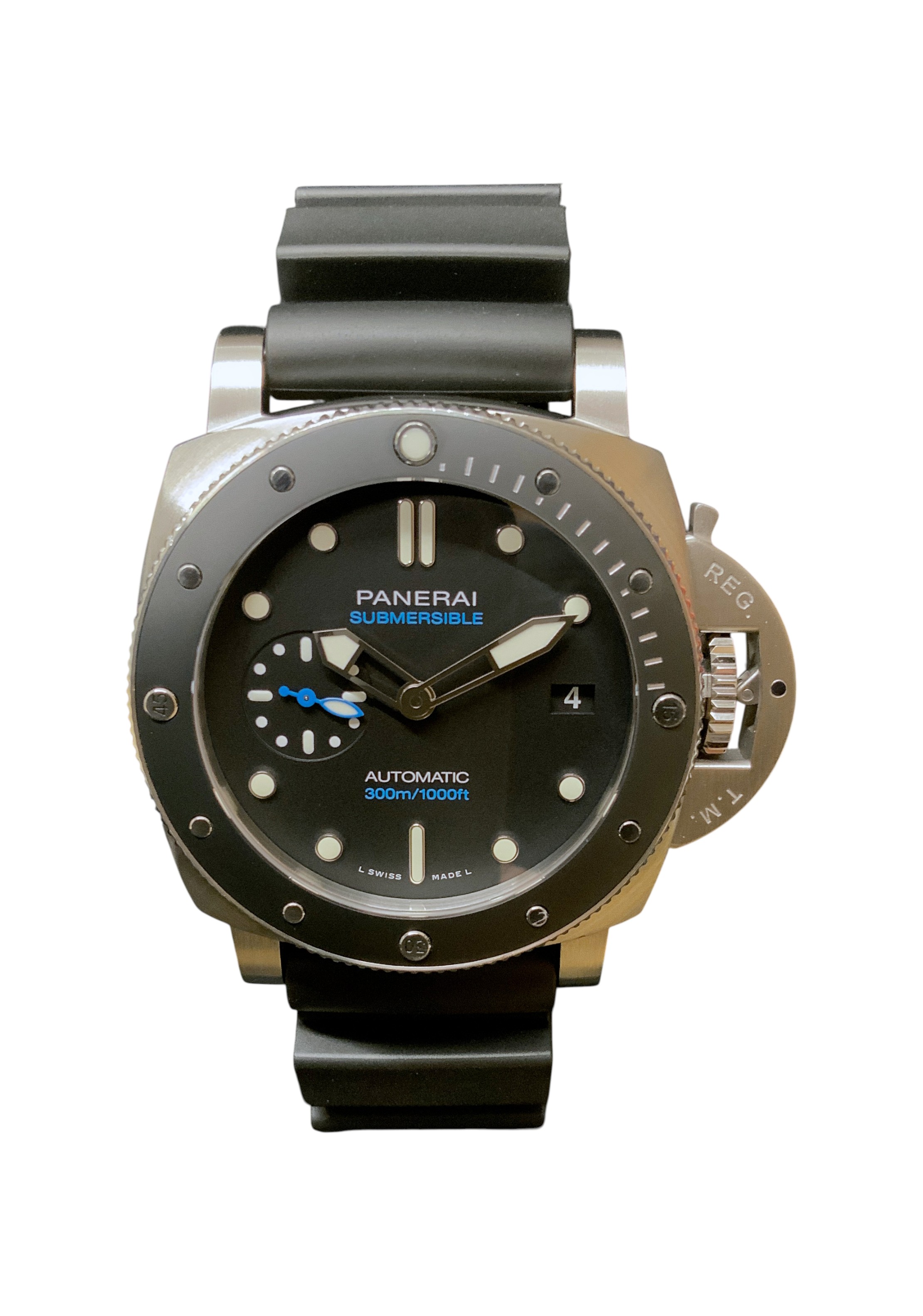 This Panerai Submersible PAM00683 has a black dial and a rubber strap. This Panerai has undergone a thorough inspection of accuracy, functionality and condition at our Panerai certified service centre to determine the level of reconditioning required to meet our strict standards. It has also been checked against our records to ensure authenticity. Our watches have a 24-month warranty for your peace of mind, in conjunction with any remaining manufacturer’s warranty from new or from service.