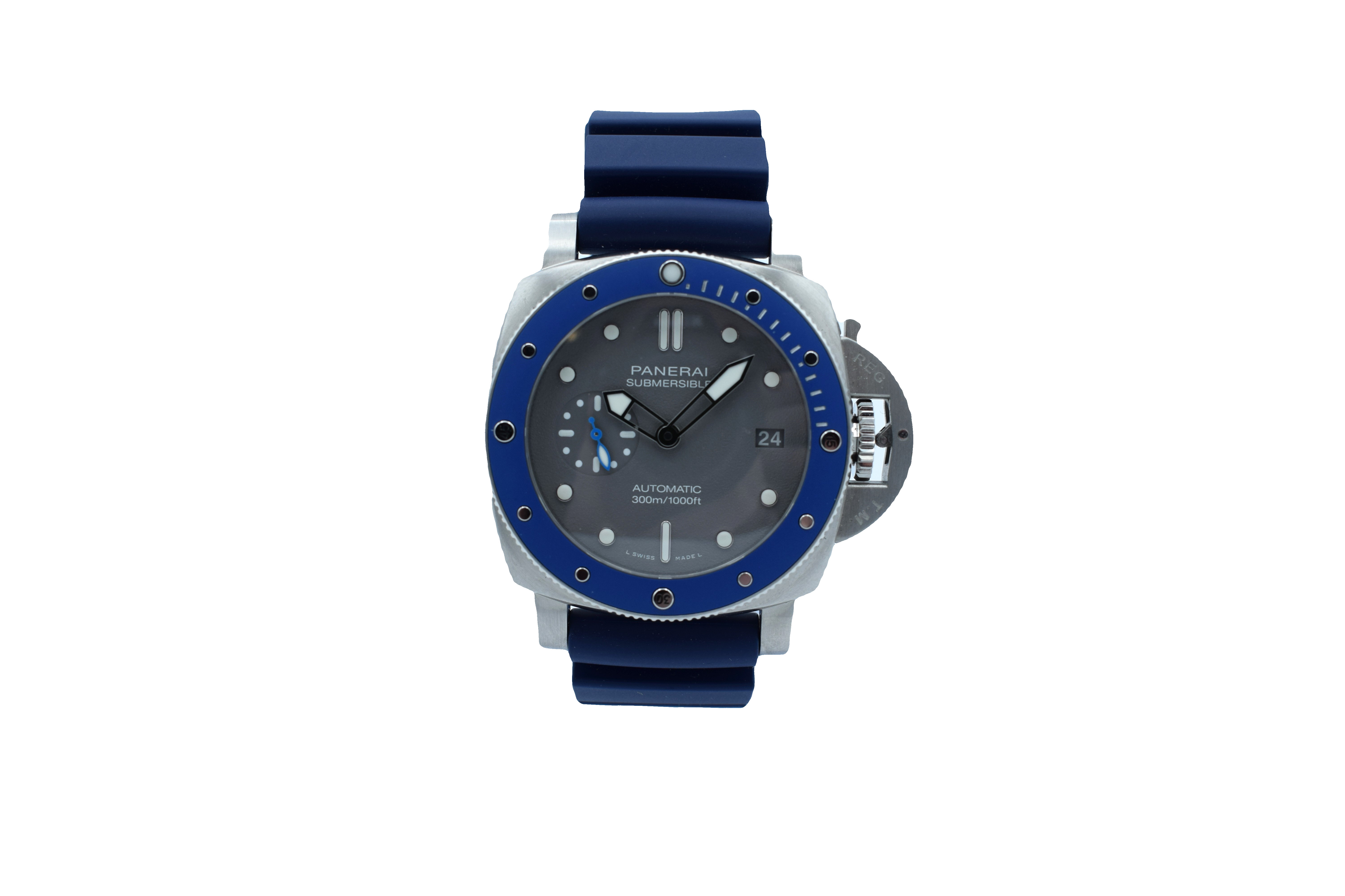 This Panerai Submersible PAM00959 has a grey dial and a rubber strap. This Panerai has undergone a thorough inspection of accuracy, functionality and condition at our Panerai certified service centre to determine the level of reconditioning required to meet our strict standards. It has also been checked against our records to ensure authenticity. All our watches have a 24-month warranty for your peace of mind.
