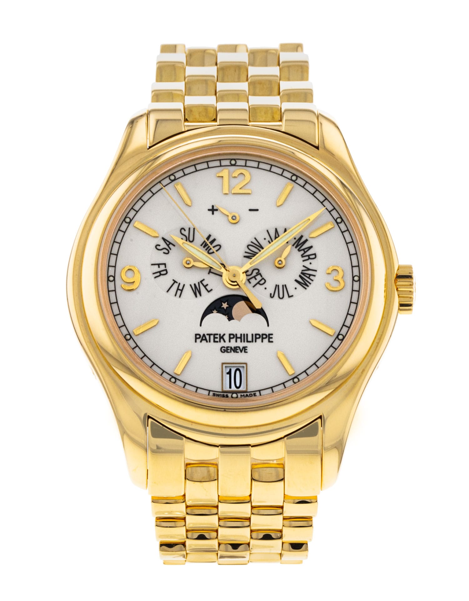 This Patek Philippe Annual Calendar 5146/1J-001 has a beige quarter arabic dial and a bracelet strap. This Patek Philippe has undergone a thorough inspection of water resistance, accuracy, functionality and condition to determine the level of reconditioning required to meet our strict standards. It has also been referenced against technical documents and manufacturer records where available to ensure authenticity and a clean history. Our watches have a 24-month warranty for your peace of mind, in conjunction with any remaining manufacturer’s warranty from new or from service.