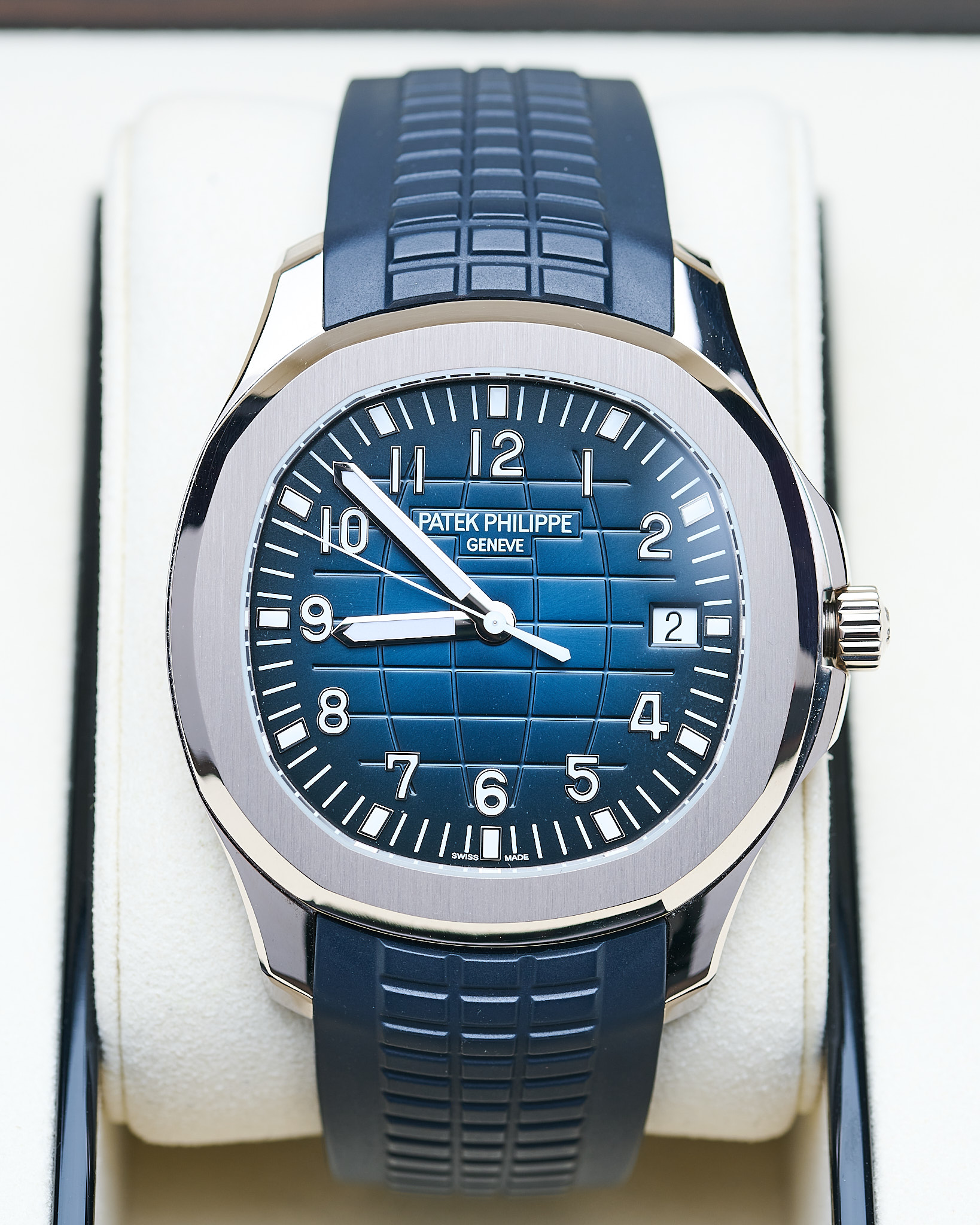 This Patek Philippe Aquanaut 5168G-001 has a blue arabic dial and a rubber strap. This Patek Philippe has undergone a thorough inspection of water resistance, accuracy, functionality and condition to determine the level of reconditioning required to meet our strict standards. It has also been referenced against technical documents and manufacturer records where available to ensure authenticity and a clean history. All our watches have a 24-month warranty for your peace of mind.