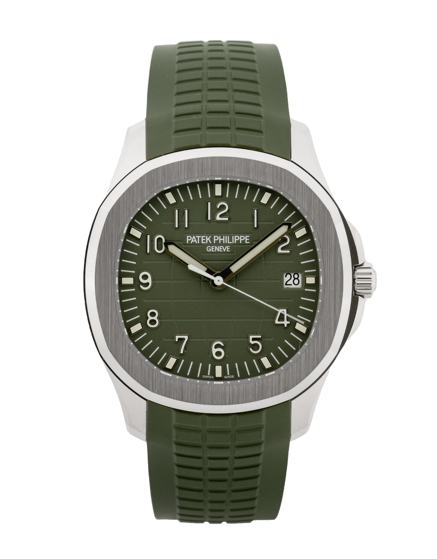 This Patek Philippe Aquanaut 5168G-010 has a khaki arabic dial and a rubber strap. This Patek Philippe has undergone a thorough inspection of water resistance, accuracy, functionality and condition to determine the level of reconditioning required to meet our strict standards. It has also been referenced against technical documents and manufacturer records where available to ensure authenticity and a clean history. All our watches have a 24-month warranty for your peace of mind.