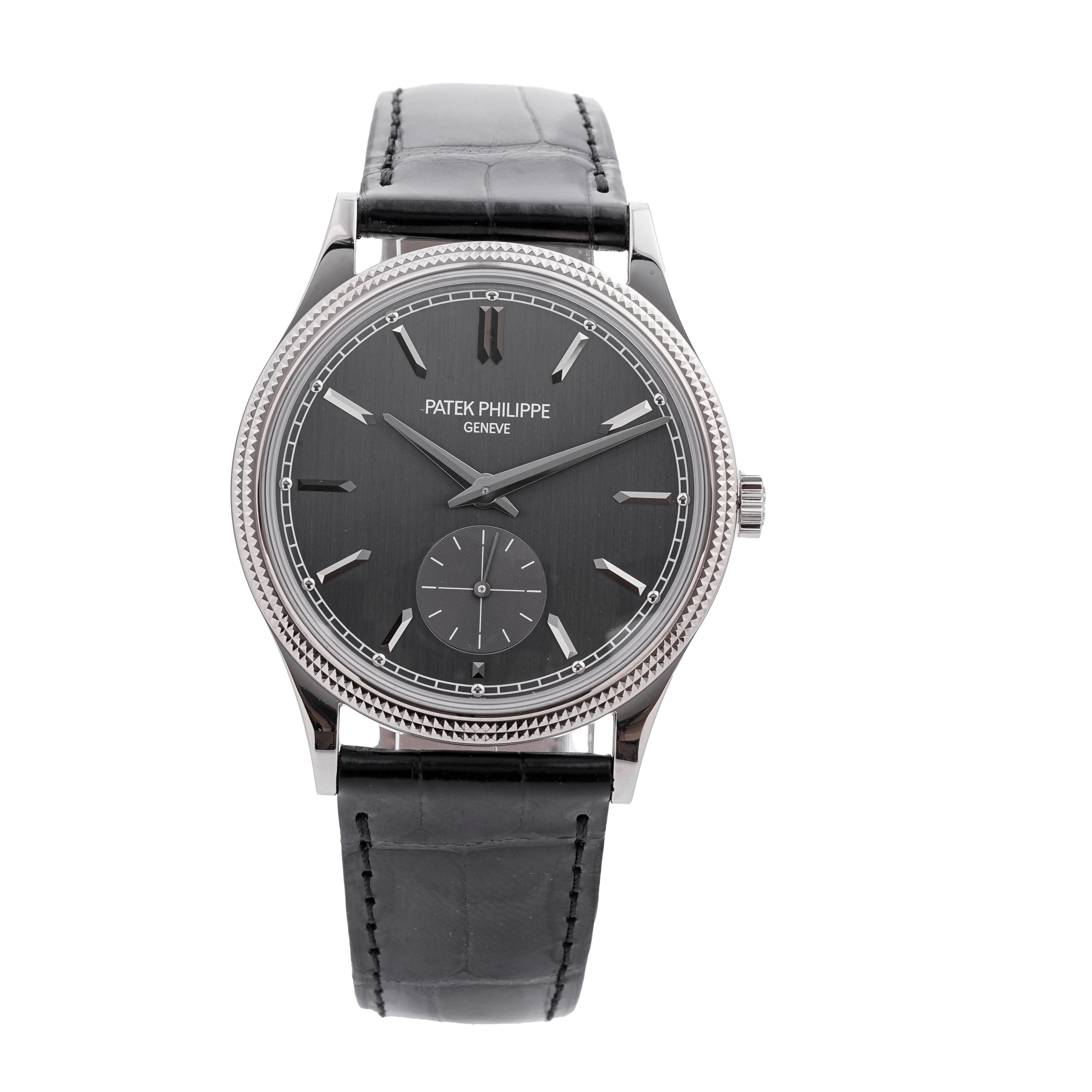 This Patek Philippe Calatrava 6119G-001 has a dark grey baton dial and a leather strap. This Patek Philippe has undergone a thorough inspection of water resistance, accuracy, functionality and condition to determine the level of reconditioning required to meet our strict standards. It has also been referenced against technical documents and manufacturer records where available to ensure authenticity and a clean history. All our watches have a 24-month warranty for your peace of mind.