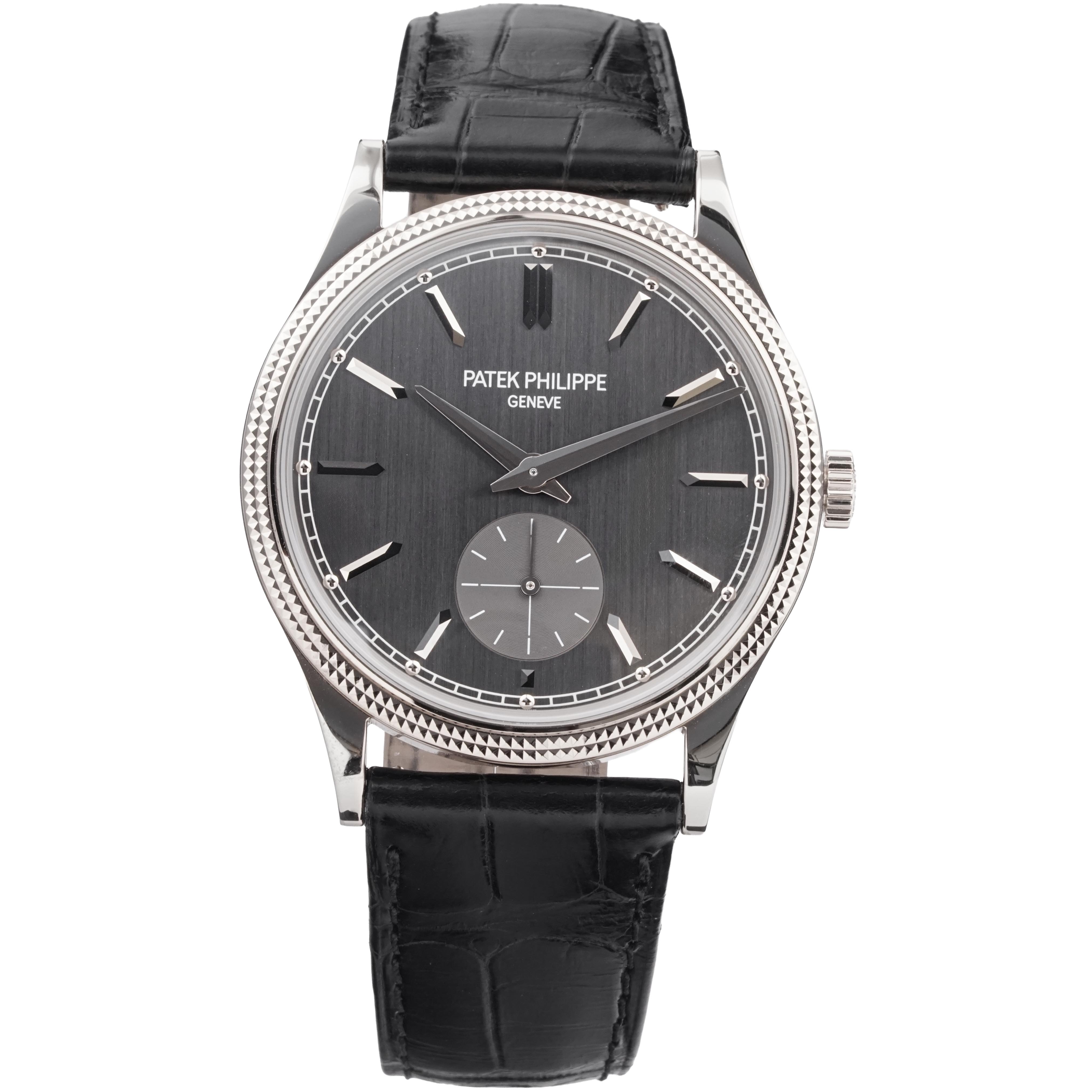 This Patek Philippe Calatrava 6119G-001 has a dark grey baton dial and a leather strap. This Patek Philippe has undergone a thorough inspection of water resistance, accuracy, functionality and condition to determine the level of reconditioning required to meet our strict standards. It has also been referenced against technical documents and manufacturer records where available to ensure authenticity and a clean history. All our watches have a 24-month warranty for your peace of mind.