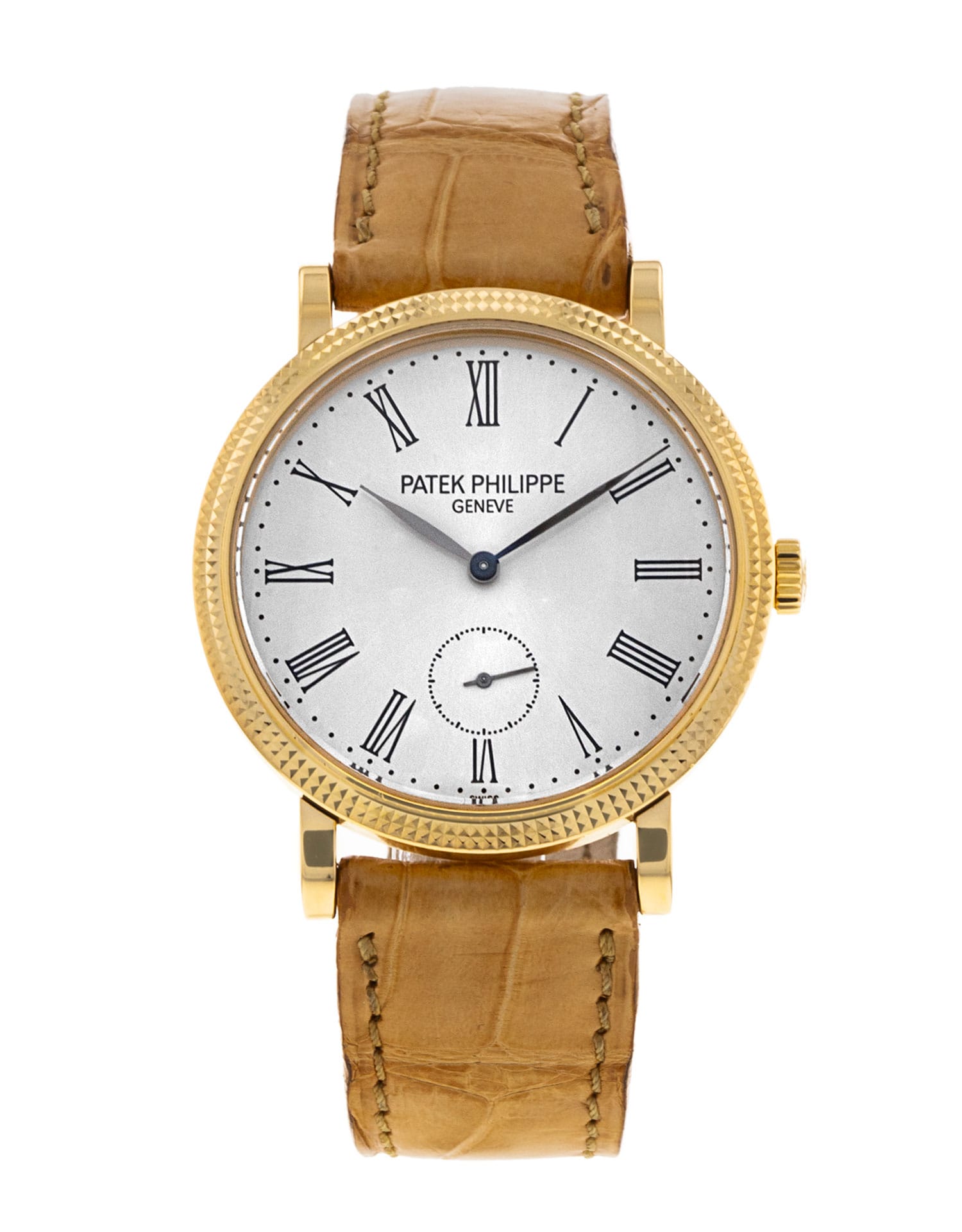 This Patek Philippe Calatrava 7119J has a white roman numeral dial and a leather strap. This Patek Philippe has undergone a thorough inspection of water resistance, accuracy, functionality and condition to determine the level of reconditioning required to meet our strict standards. It has also been referenced against technical documents and manufacturer records where available to ensure authenticity and a clean history. All our watches have a 24-month warranty for your peace of mind.