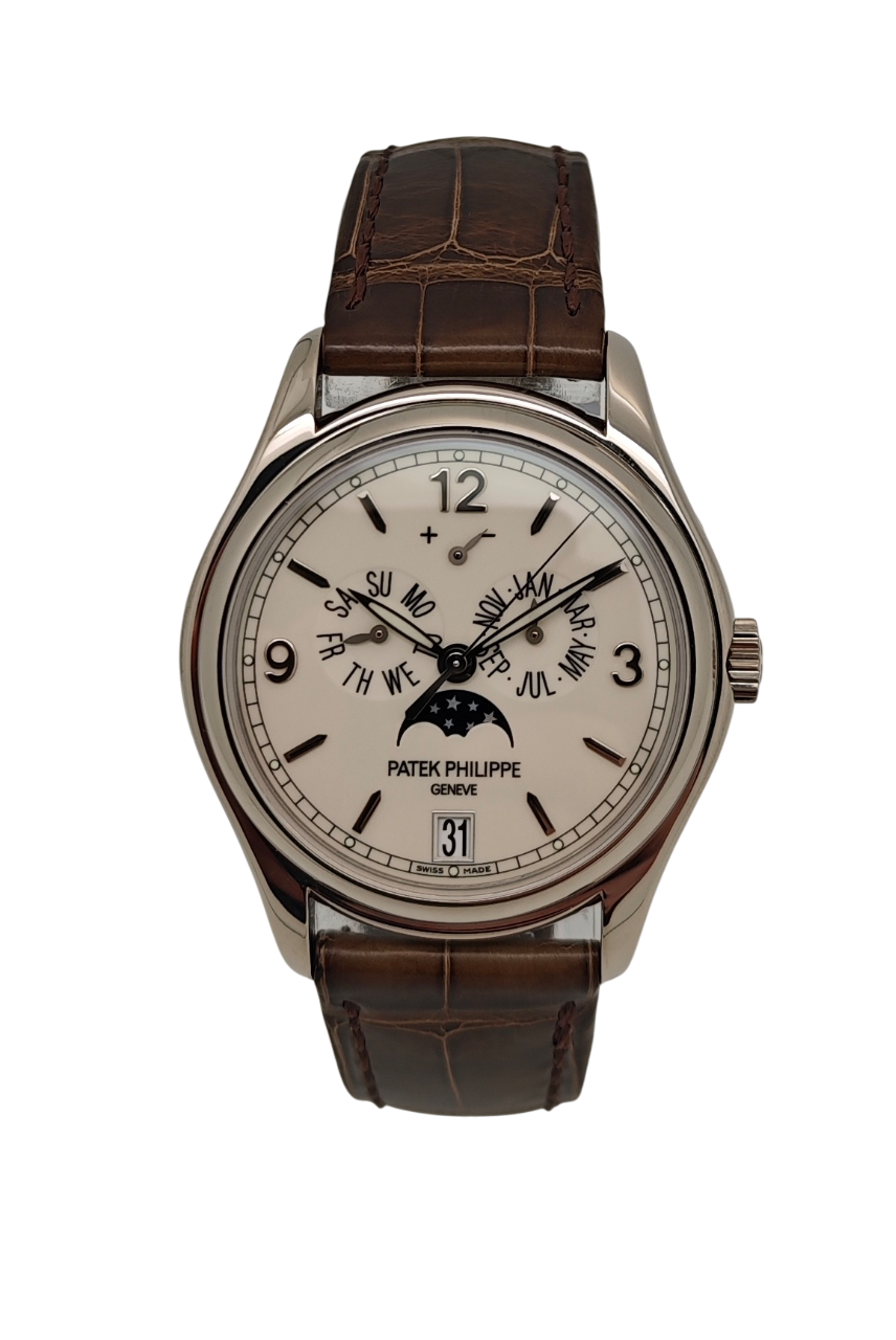 This Patek Philippe Complications 5146G-001 has a ivory quarter arabic dial and a leather strap. This Patek Philippe has undergone a thorough inspection of water resistance, accuracy, functionality and condition to determine the level of reconditioning required to meet our strict standards. It has also been referenced against technical documents and manufacturer records where available to ensure authenticity and a clean history. All our watches have a 24-month warranty for your peace of mind.