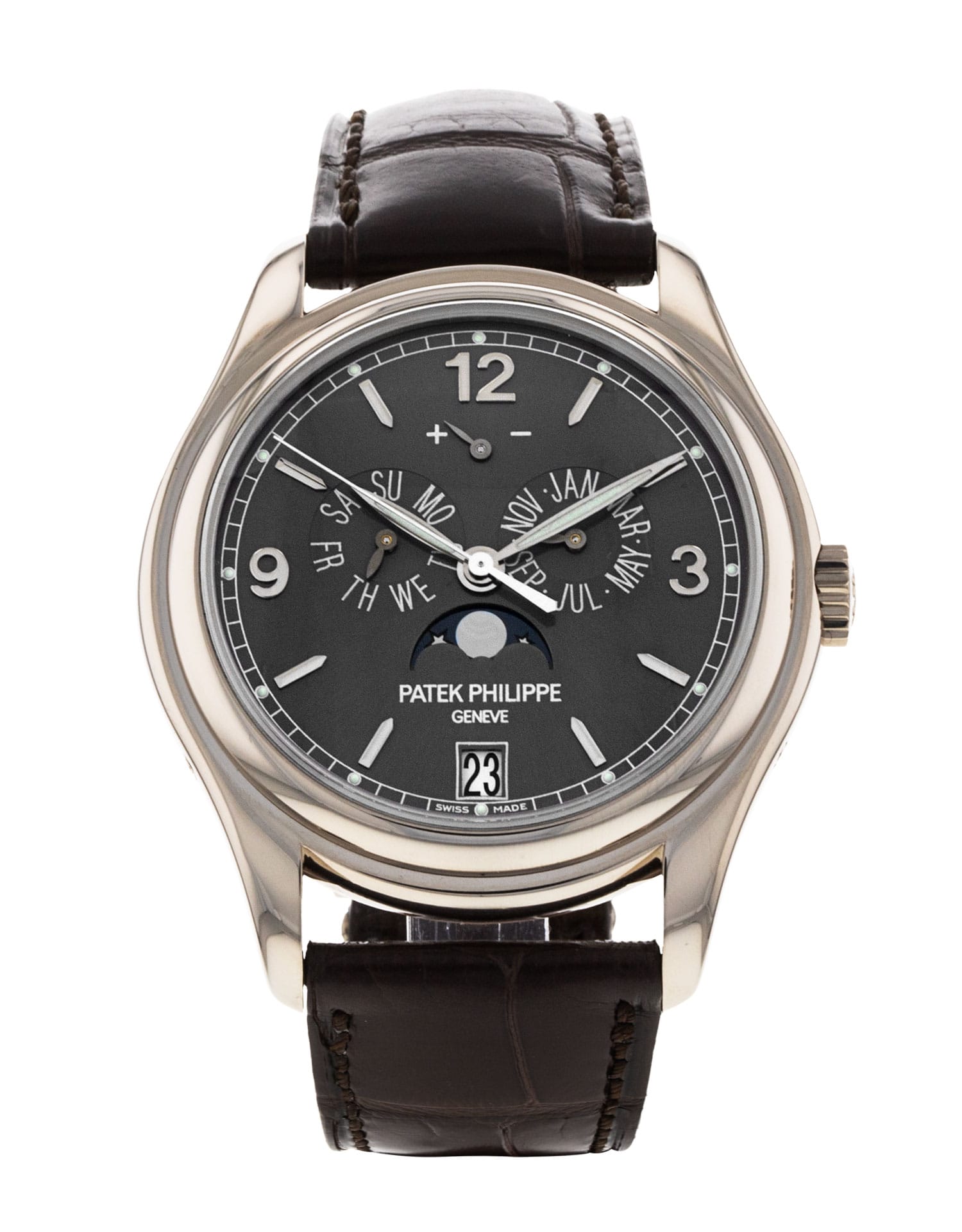 This Patek Philippe Complications 5146G-010 has a grey quarter arabic dial and a leather strap. This Patek Philippe has undergone a thorough inspection of water resistance, accuracy, functionality and condition to determine the level of reconditioning required to meet our strict standards. It has also been referenced against technical documents and manufacturer records where available to ensure authenticity and a clean history. All our watches have a 24-month warranty for your peace of mind.
