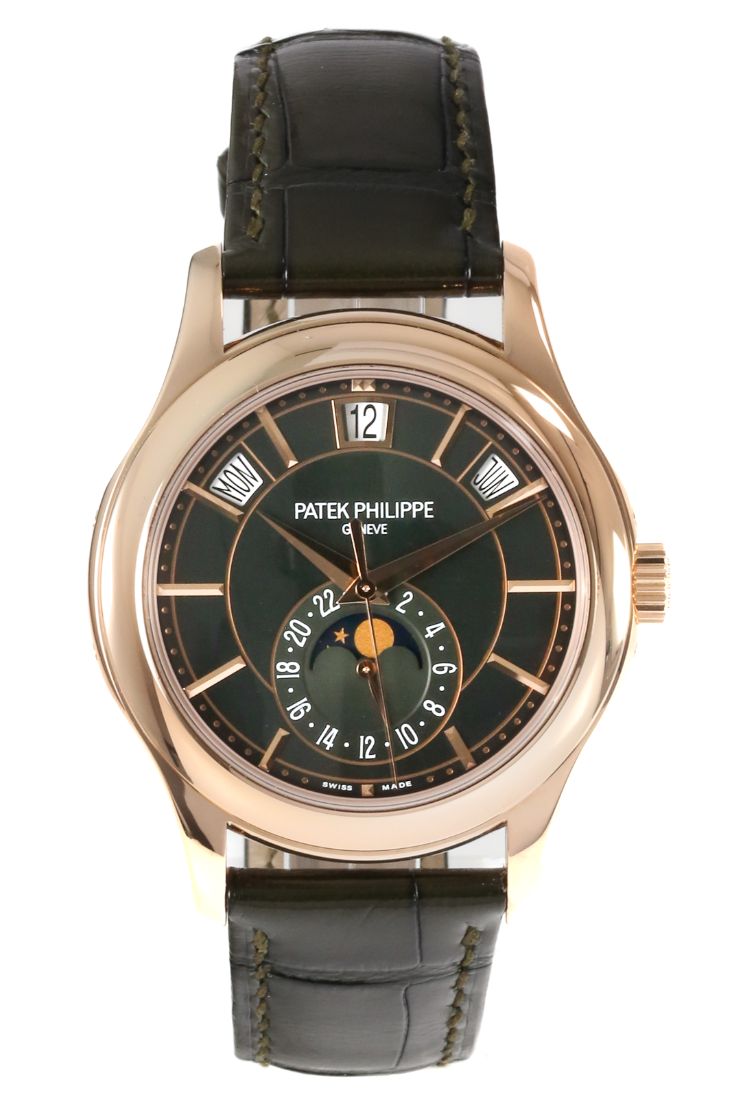 This Patek Philippe Complications 5205R-011 has a olive green baton dial and a leather strap. This Patek Philippe has undergone a thorough inspection of water resistance, accuracy, functionality and condition to determine the level of reconditioning required to meet our strict standards. It has also been referenced against technical documents and manufacturer records where available to ensure authenticity and a clean history. All our watches have a 24-month warranty for your peace of mind.