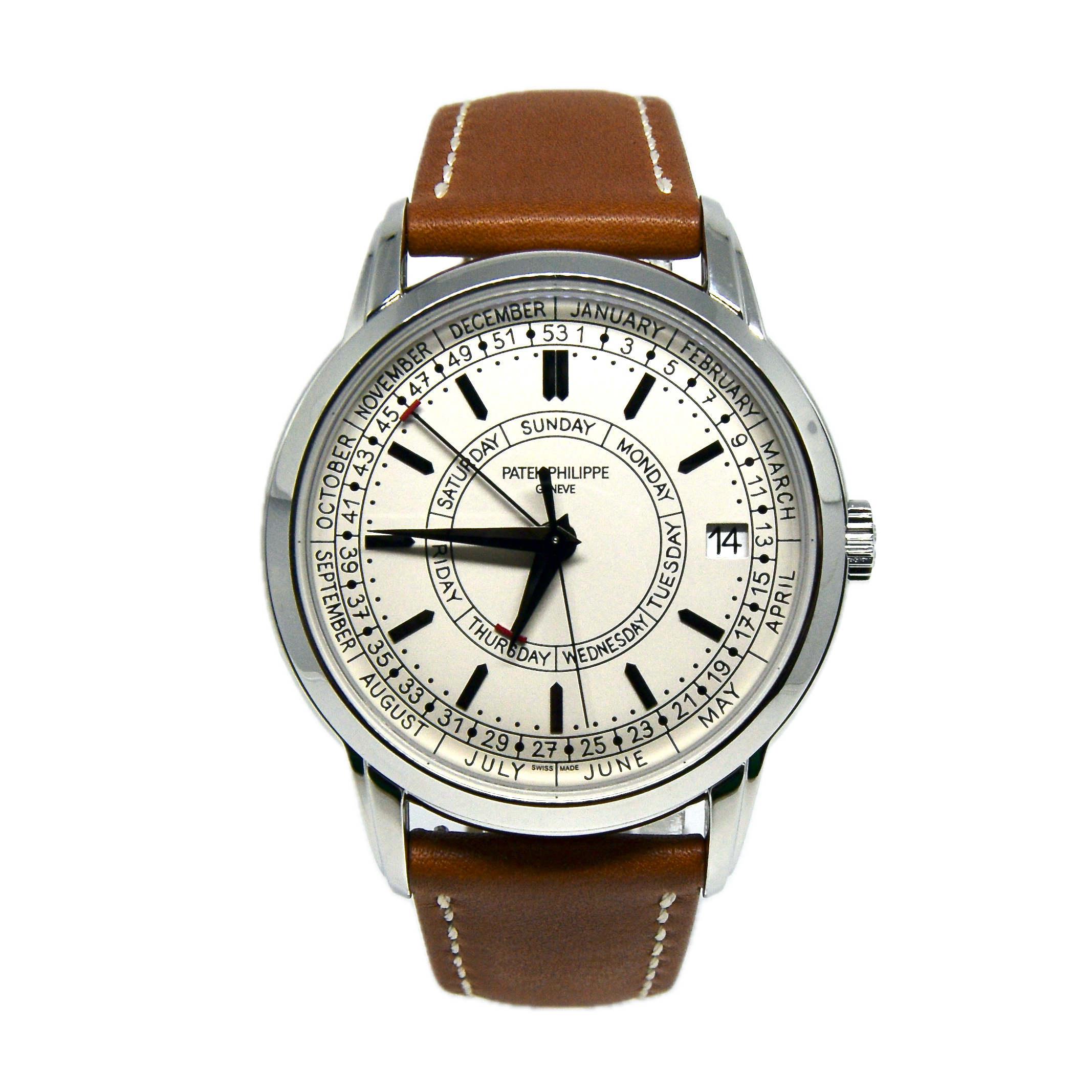 This Patek Philippe Complications 5212A-001 has a silver dial and a leather strap. This Patek Philippe has undergone a thorough inspection of water resistance, accuracy, functionality and condition to determine the level of reconditioning required to meet our strict standards. It has also been referenced against technical documents and manufacturer records where available to ensure authenticity and a clean history. All our watches have a 24-month warranty for your peace of mind.