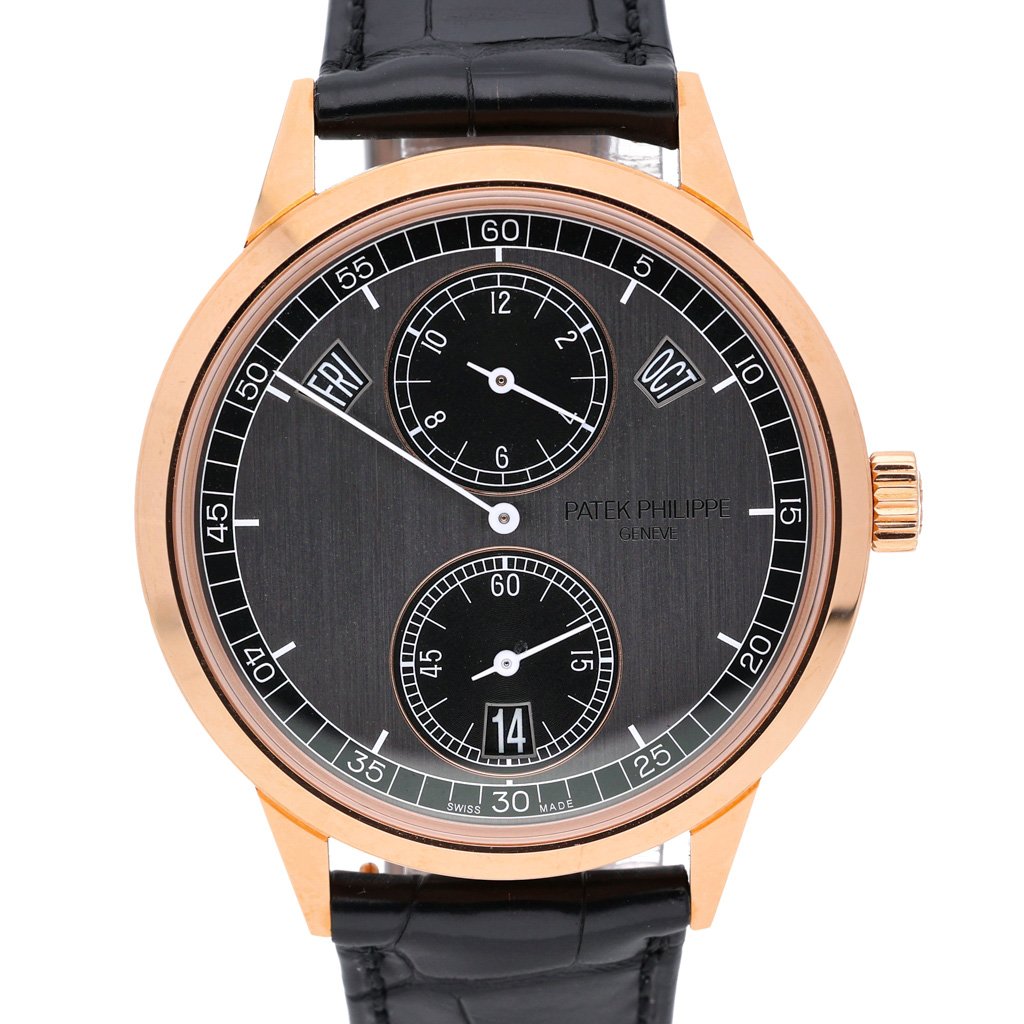 This unusual and distinctive model from arguably the world’s most prestigious watch manufacturer is an annual calendar with a regulator dial, meaning the hour, minute and second hands don’t share the same register. The hour and second hands can be found on the upper and lower subdials, respectively, while the minute hand uses the main dial. The ebony-black smaller dials stand out on the graphite dial and the white stick hands enhance the minimalist aesthetic. The annual calendar—meaning the date only needs to be manually adjusted at the end of February—is displayed via two windows for the day and month that lie either side of the hour subdial while the date is discreetly displayed in a small aperture at 6 o’clock, completing the symmetry. Fittingly for such a watch, even the movement is unconventional. It’s run on an automatic 31-260 REG QA movement with gold micro-rotor, visible through the exhibition caseback.