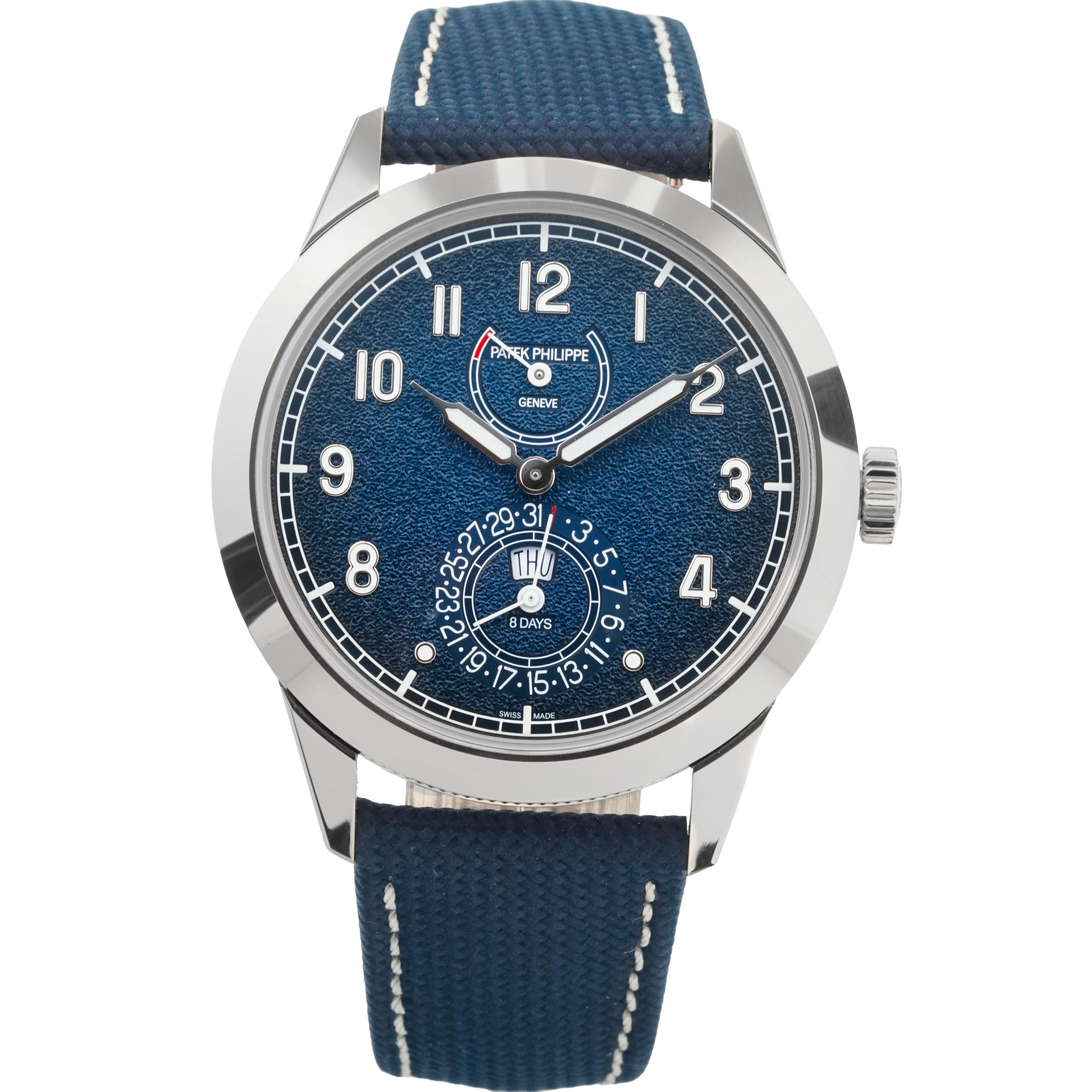 This Patek Philippe Complications 5328G-001 has a blue arabic dial and a leather strap. This Patek Philippe has undergone a thorough inspection of water resistance, accuracy, functionality and condition to determine the level of reconditioning required to meet our strict standards. It has also been referenced against technical documents and manufacturer records where available to ensure authenticity and a clean history. Our watches have a 24-month warranty for your peace of mind, in conjunction with any remaining manufacturer’s warranty from new or from service.