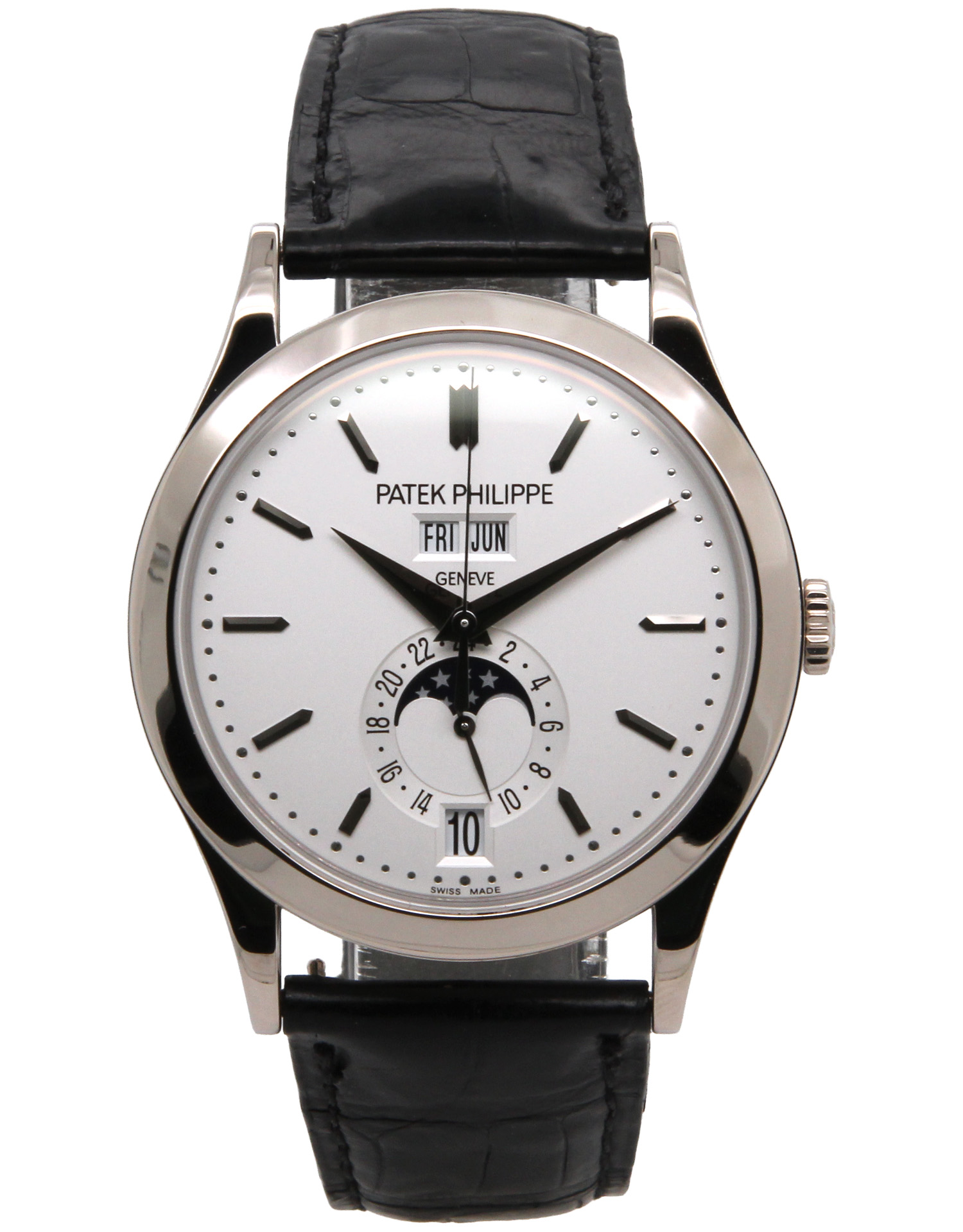 This Patek Philippe Complications 5396G-011 has a silver baton dial and a leather strap. This Patek Philippe has undergone a thorough inspection of water resistance, accuracy, functionality and condition to determine the level of reconditioning required to meet our strict standards. It has also been referenced against technical documents and manufacturer records where available to ensure authenticity and a clean history. All our watches have a 24-month warranty for your peace of mind.