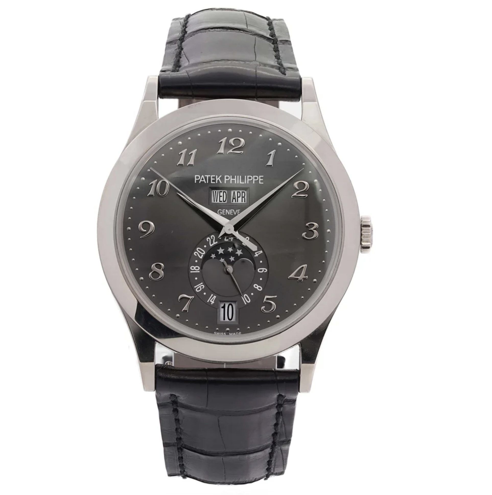 This Patek Philippe Complications 5396G-014 has a grey arabic dial and a leather strap. This Patek Philippe has undergone a thorough inspection of water resistance, accuracy, functionality and condition to determine the level of reconditioning required to meet our strict standards. It has also been referenced against technical documents and manufacturer records where available to ensure authenticity and a clean history. All our watches have a 24-month warranty for your peace of mind.
