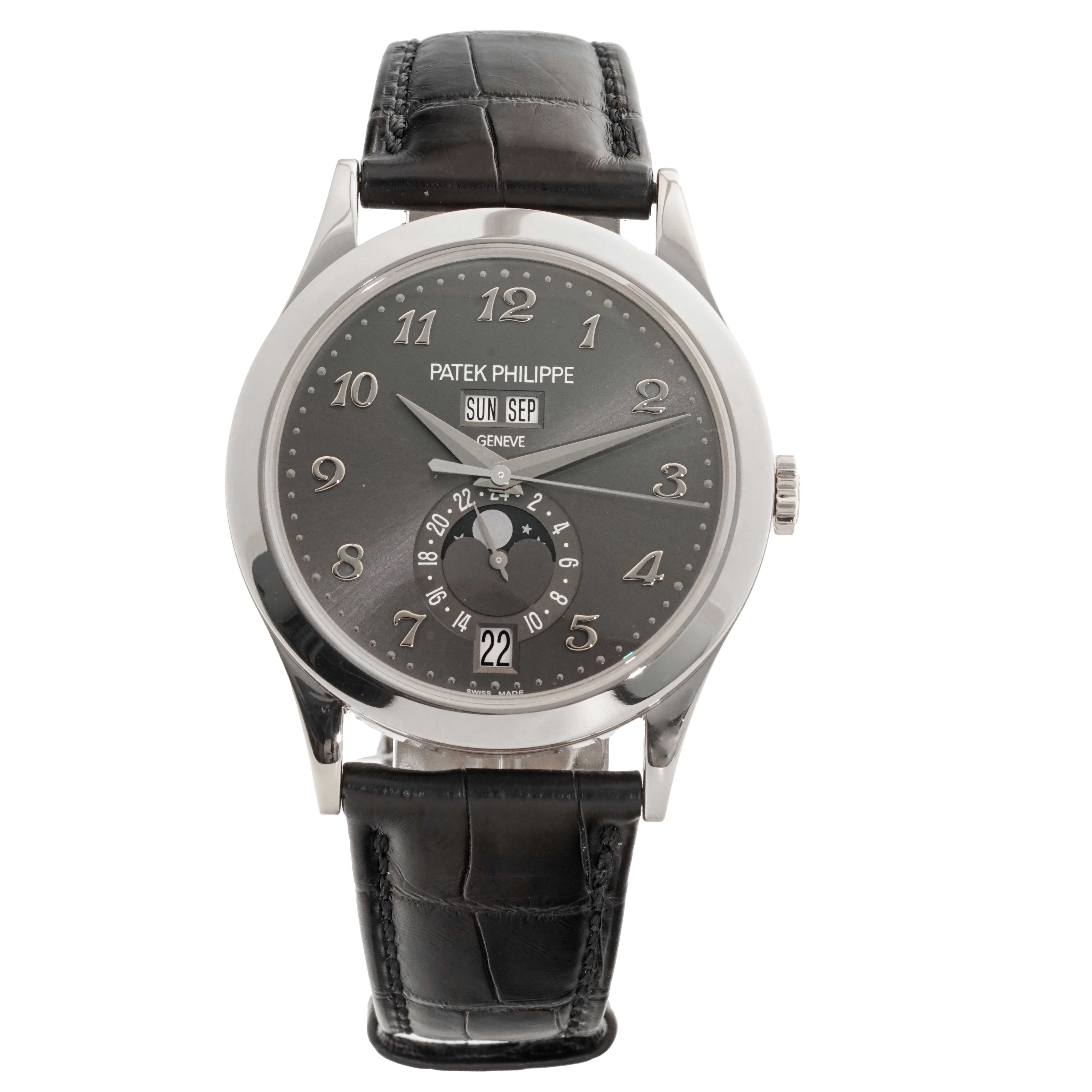 This Patek Philippe Complications 5396G-014 has a grey arabic dial and a leather strap. This Patek Philippe has undergone a thorough inspection of water resistance, accuracy, functionality and condition to determine the level of reconditioning required to meet our strict standards. It has also been referenced against technical documents and manufacturer records where available to ensure authenticity and a clean history. All our watches have a 24-month warranty for your peace of mind.