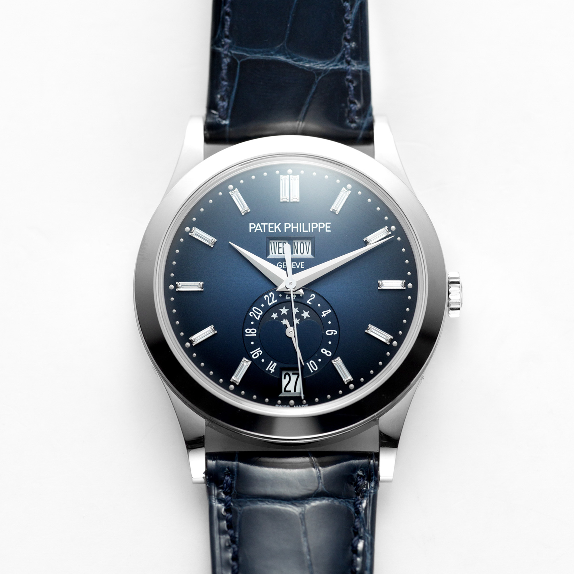This Patek Philippe Complications 5396G-017 has a blue baton dial and a leather strap. This Patek Philippe has undergone a thorough inspection of water resistance, accuracy, functionality and condition to determine the level of reconditioning required to meet our strict standards. It has also been referenced against technical documents and manufacturer records where available to ensure authenticity and a clean history. Our watches have a 24-month warranty for your peace of mind, in conjunction with any remaining manufacturer’s warranty from new or from service.